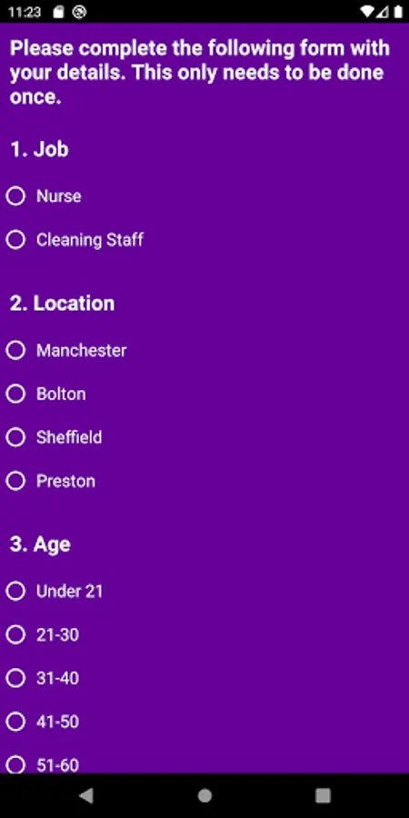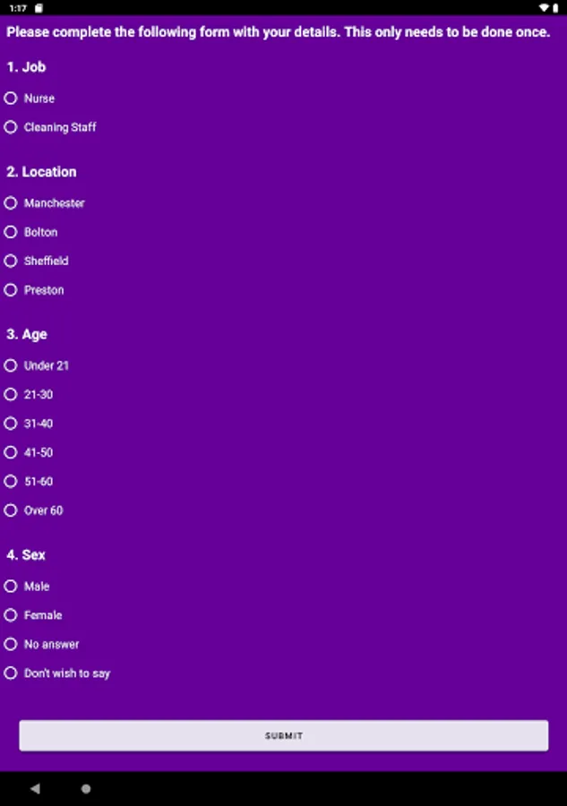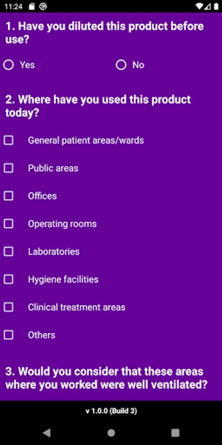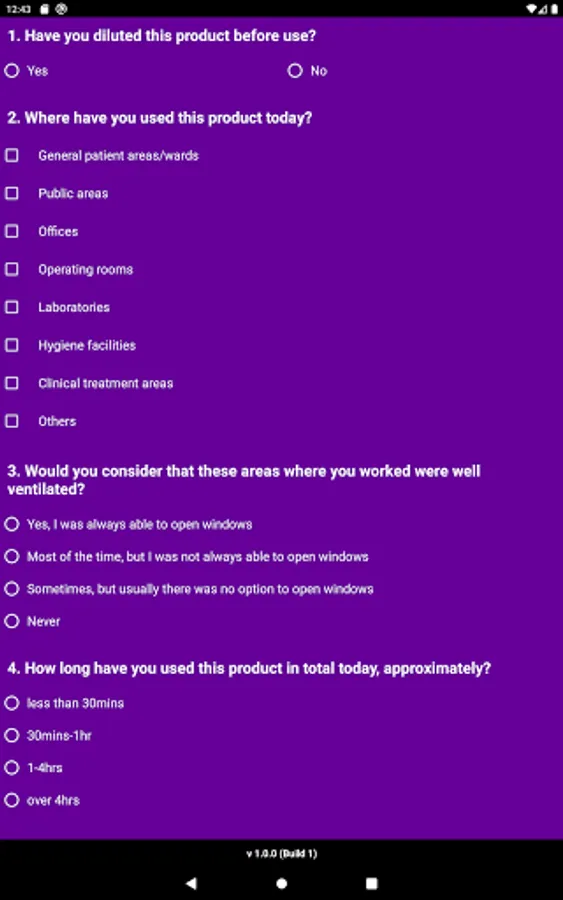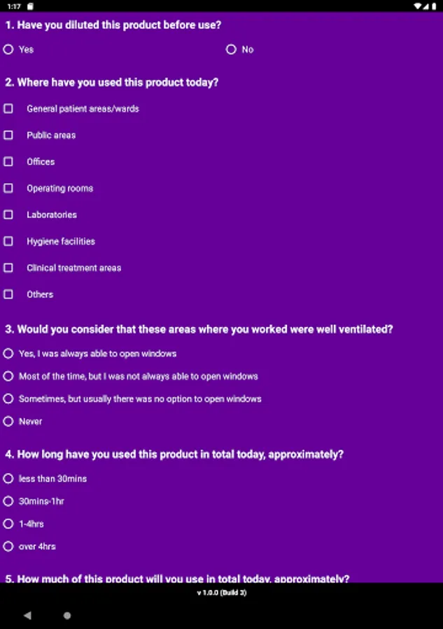 Users' basic demographic info (job / location / gender / age range) along with a product barcode (sourced via the barcode scanner in the app) is sent to a secure University hosted database; along with text/numeric answers chosen from specified options, to questions about the product's usage environment (where used / ventilated or not / dilution details / how much used / how long used).