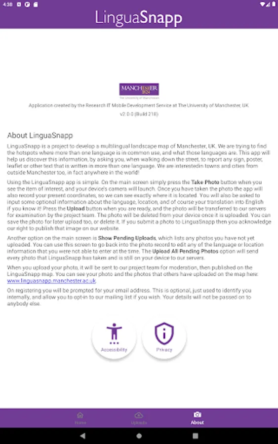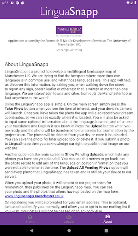 LinguaSnapp is a project to develop a multilingual landscape map of Manchester, UK. App users can help discover the hotspots where more than one language is in common use, and what those languages are, by uploading photos of the multilingual signs, posters, leaflets and other texts around them. We are interested in towns and cities from outside Manchester too; in fact, anywhere in the world!