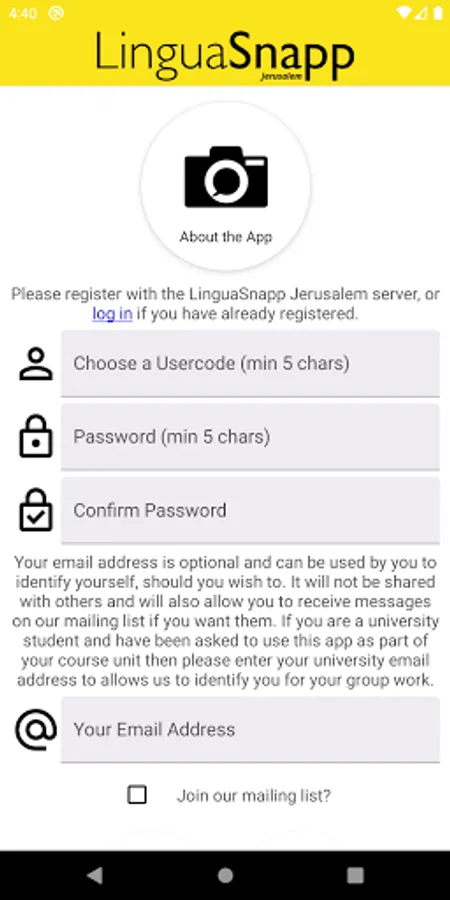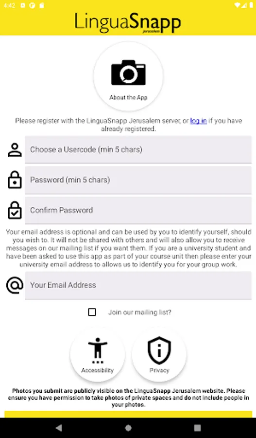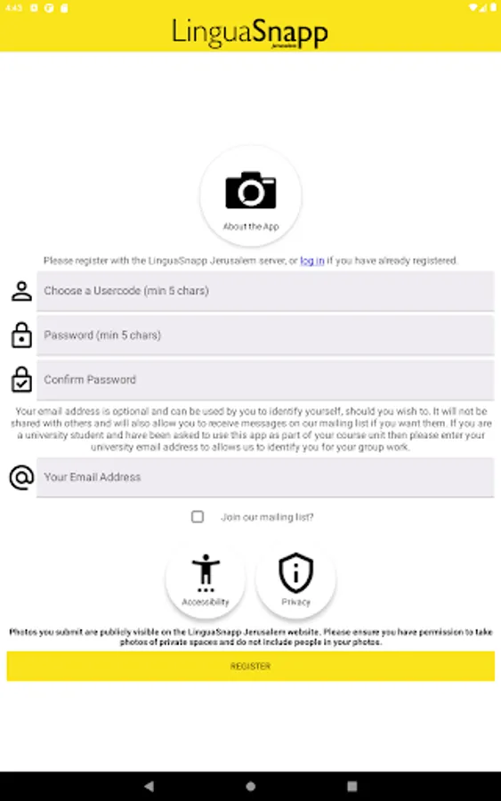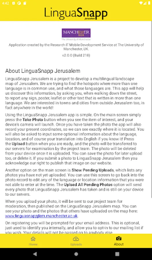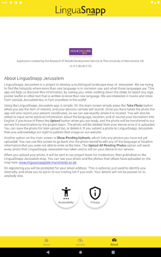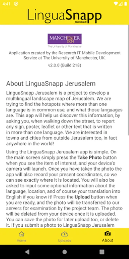 LinguaSnapp Jerusalem is a project to develop a multilingual landscape map of Jerusalem. App users can help discover the hotspots where more than one language is in common use, and what those languages are, by uploading photos of the multilingual signs, posters, leaflets and other texts around them. We are interested in towns and cities from outside Jerusalem too; in fact, anywhere in the world!