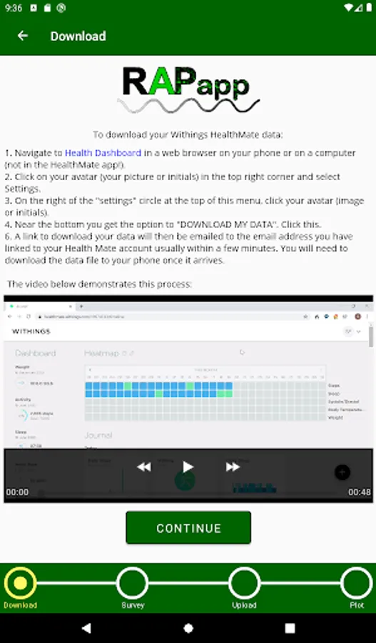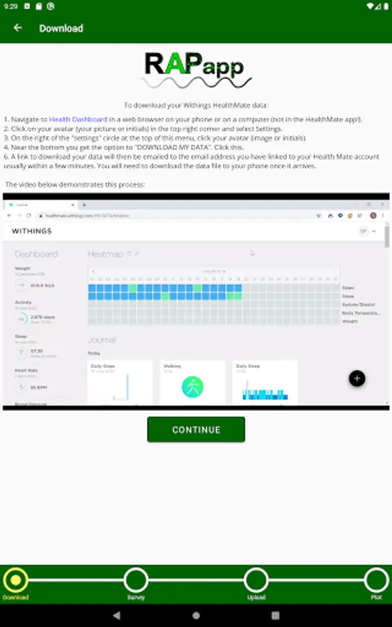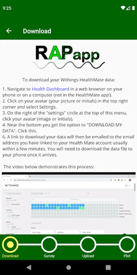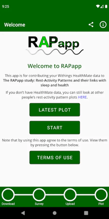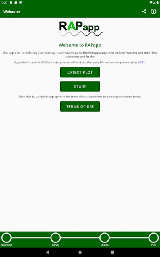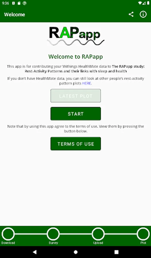 This app is for contributing your Withings HealthMate data to “The RAPapp study: Rest-Activity Patterns and their links with sleep and health”. The Rest-Activity Pattern app (RAPapp) study aims to find out more about the different ways lockdown has affected different people’s rest-activity patterns, and how these changes might affect sleep and health. We need citizen scientists who have already been tracking their activity since before the pandemic, using the Withings Health Mate app (with either a wearable/watch or phone step-tracking), to download and contribute their data. The Rest-Activity Pattern app will show you how to download, will ask you some brief survey questions, and create your unique rest-activity pattern plot. If you don’t have HealthMate data, you can still look at other people’s rest-activity pattern plots here (https://www.instagram.com/rapapp_study/ ). The study is being run by The University of Manchester. To find out more click here (https://sleepot.org/rapapp-study/).