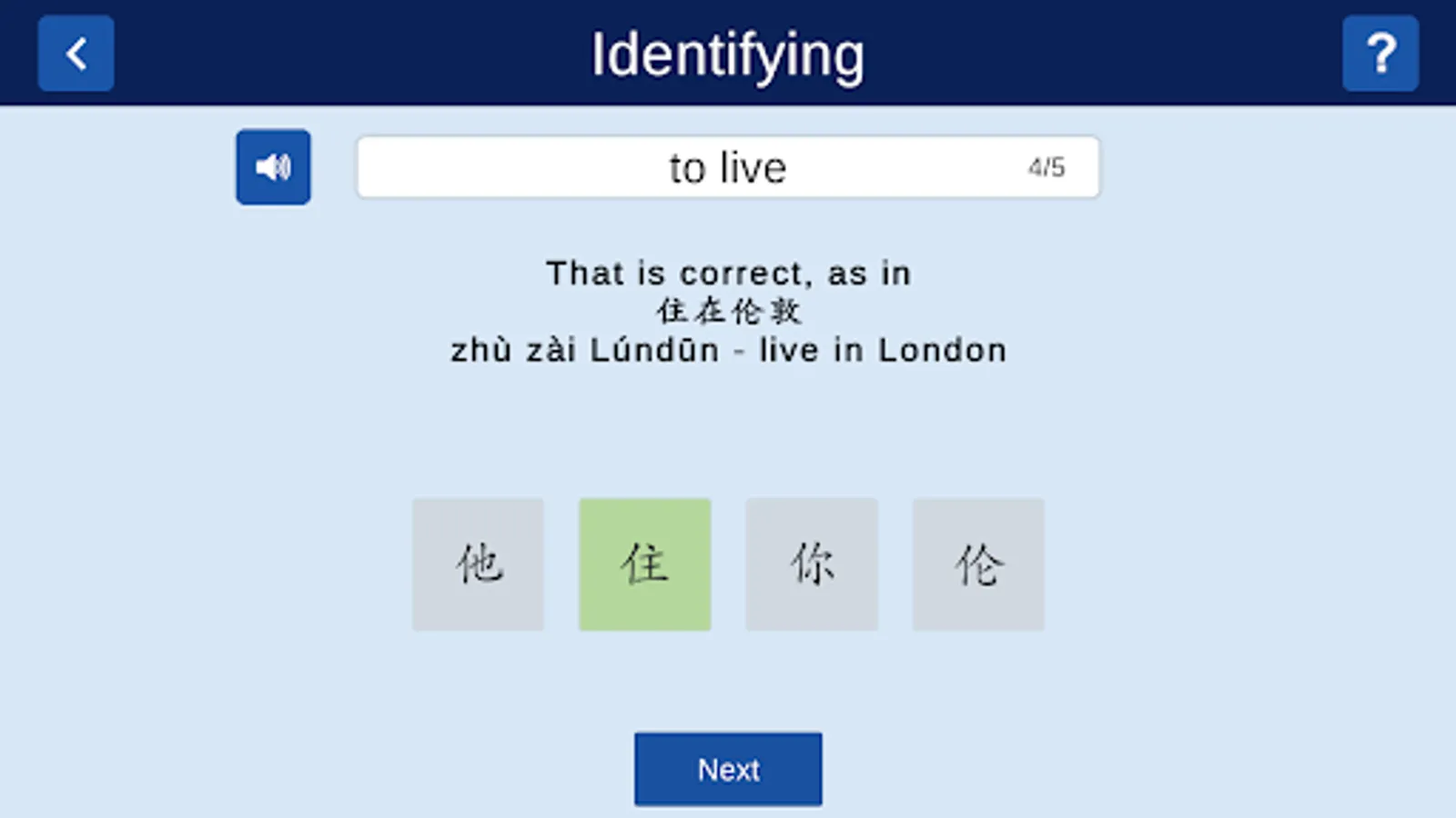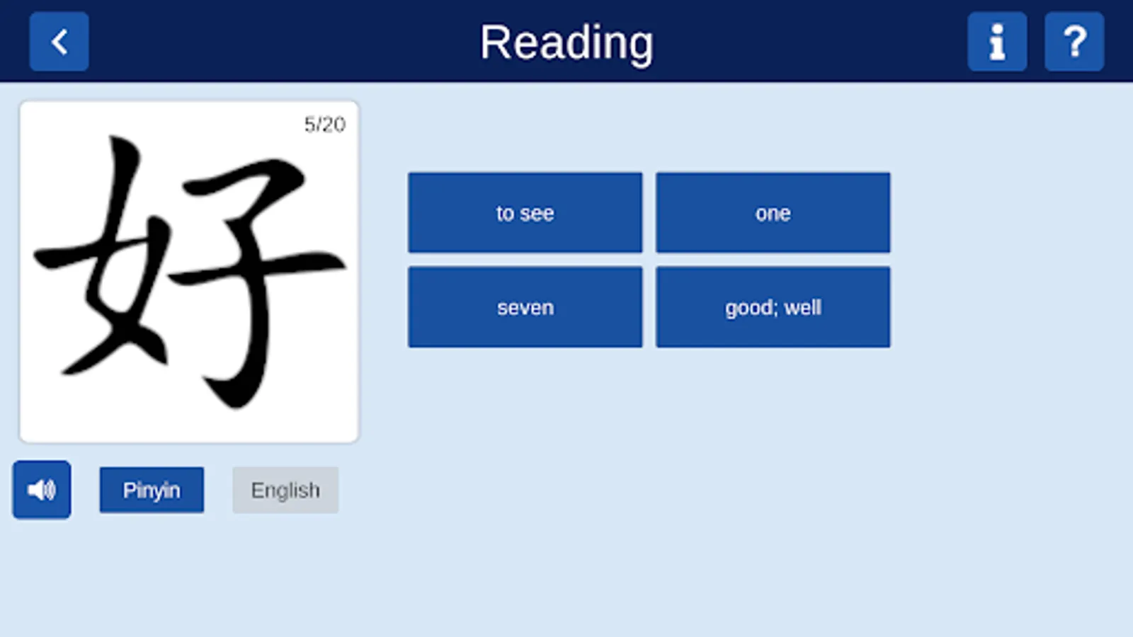 Identifying: Here you are presented with five groups of characters. Each group consists of four similar looking characters. You will need to choose the character that matches the English. The feedback provides a word/phrase that contains this character.