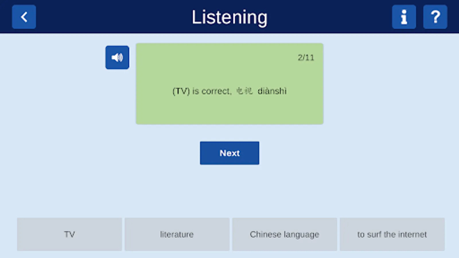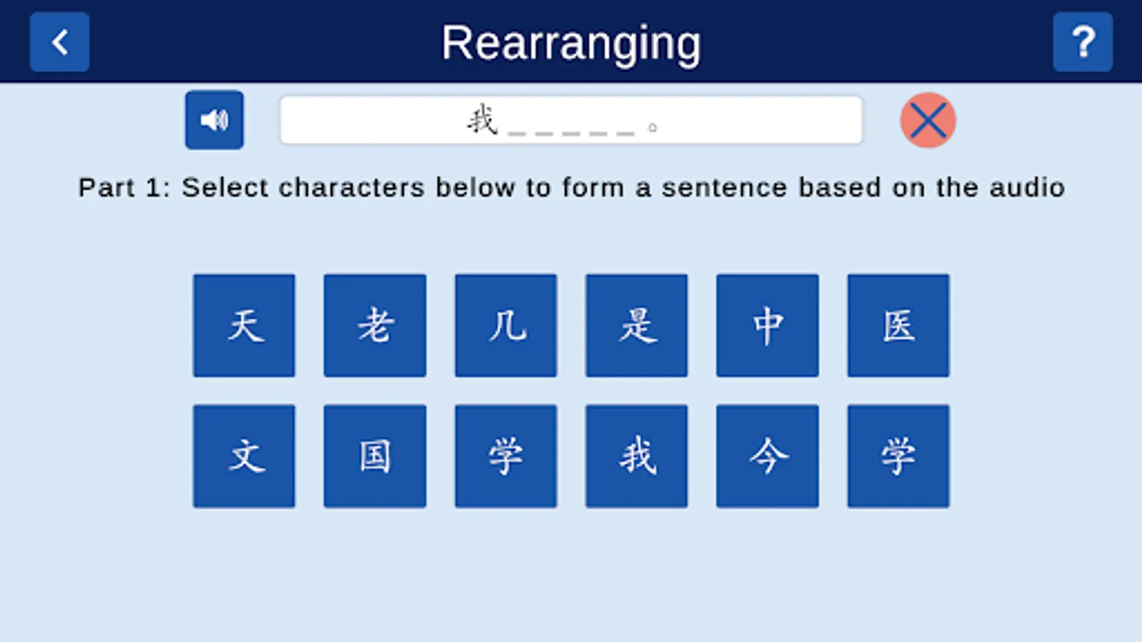 Rearranging: Here you get the opportunity to practise forming a sentence based on the audio you hear, using the characters provided, which you have already learnt. Instant feedback is provided.