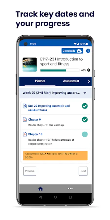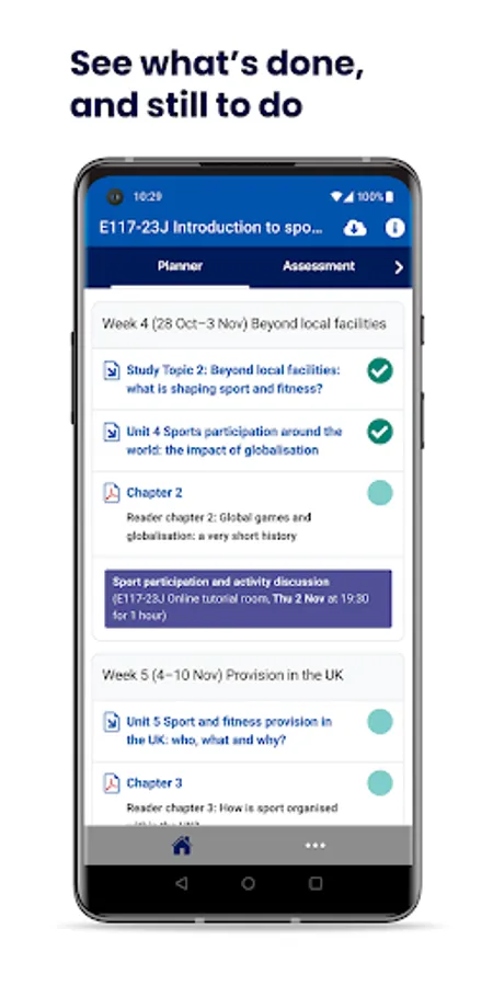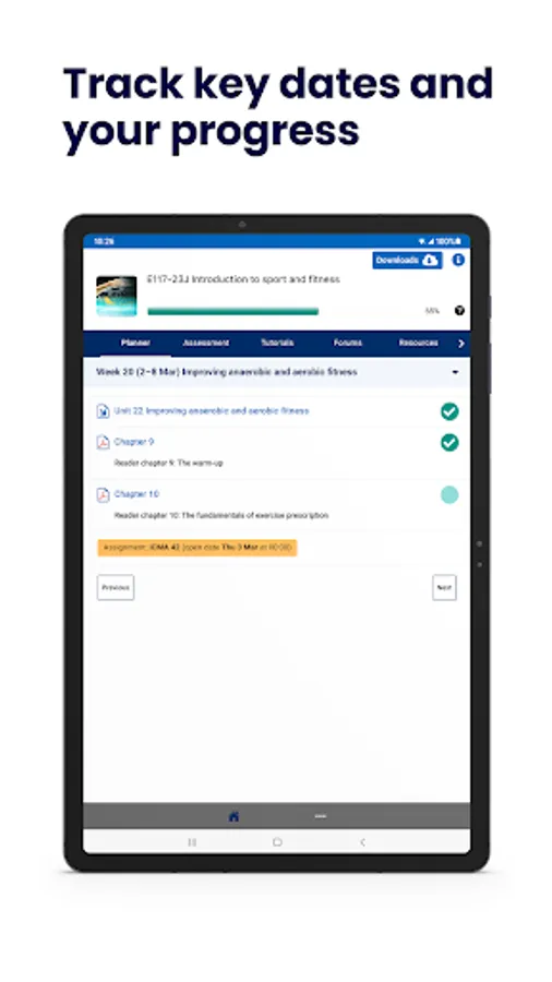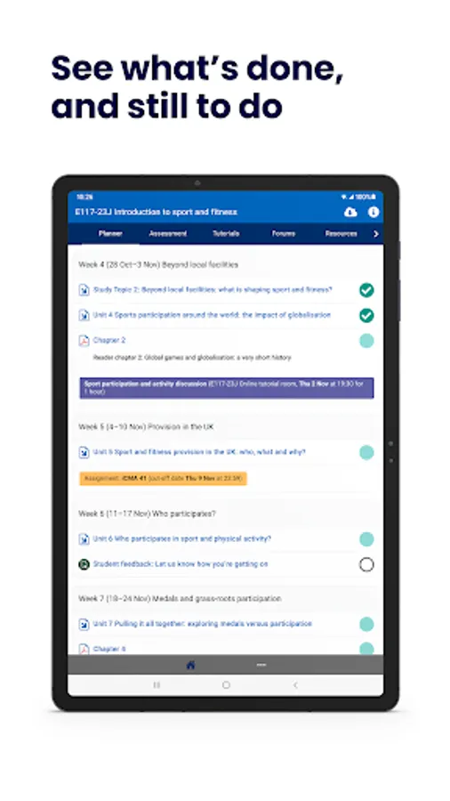 • OU Study App and your module website are synced. As you tick completed resources or save an answer, both the module website and the app are updated.