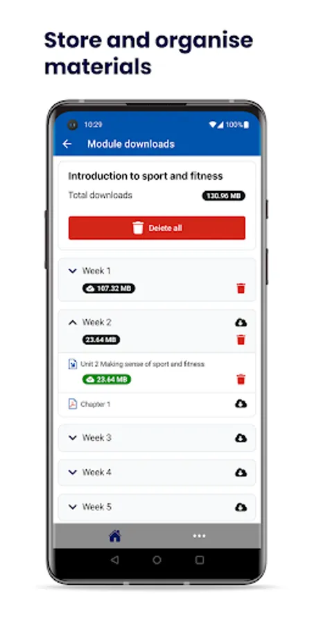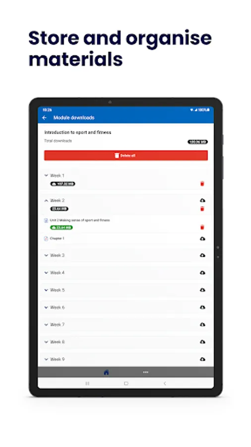 • Download learning materials individually and batch download by week using Course downloads. Return to the Planner, to access downloaded materials. If you need to free space, delete them on Course downloads.