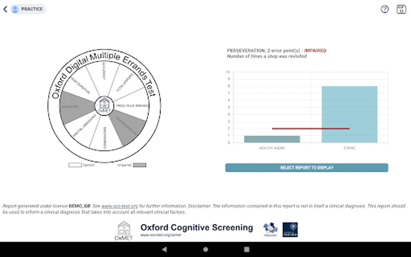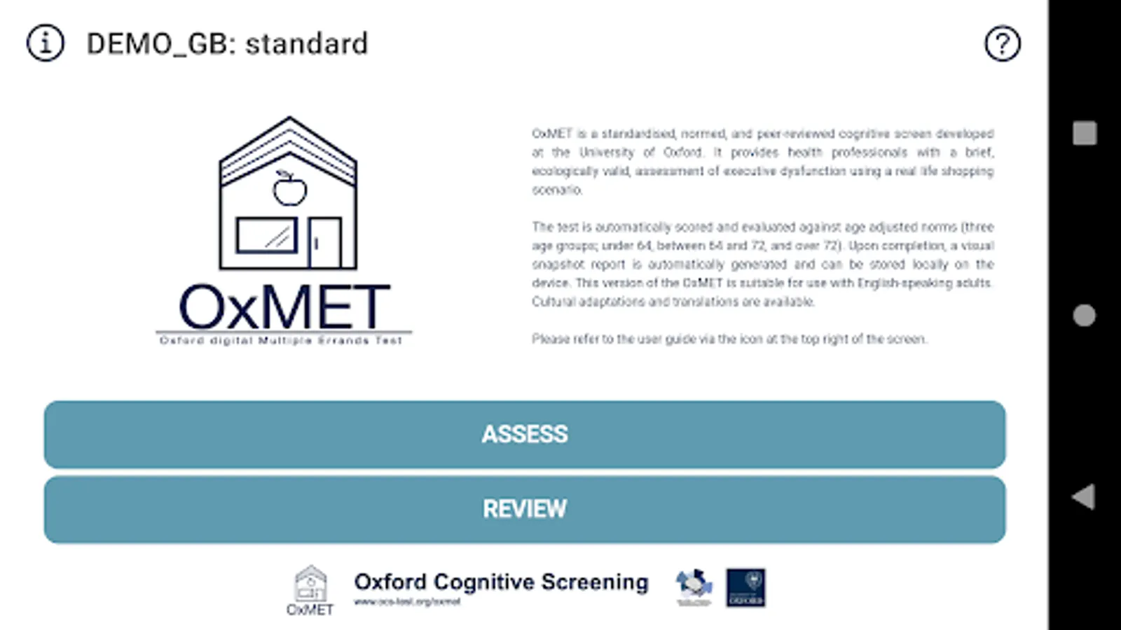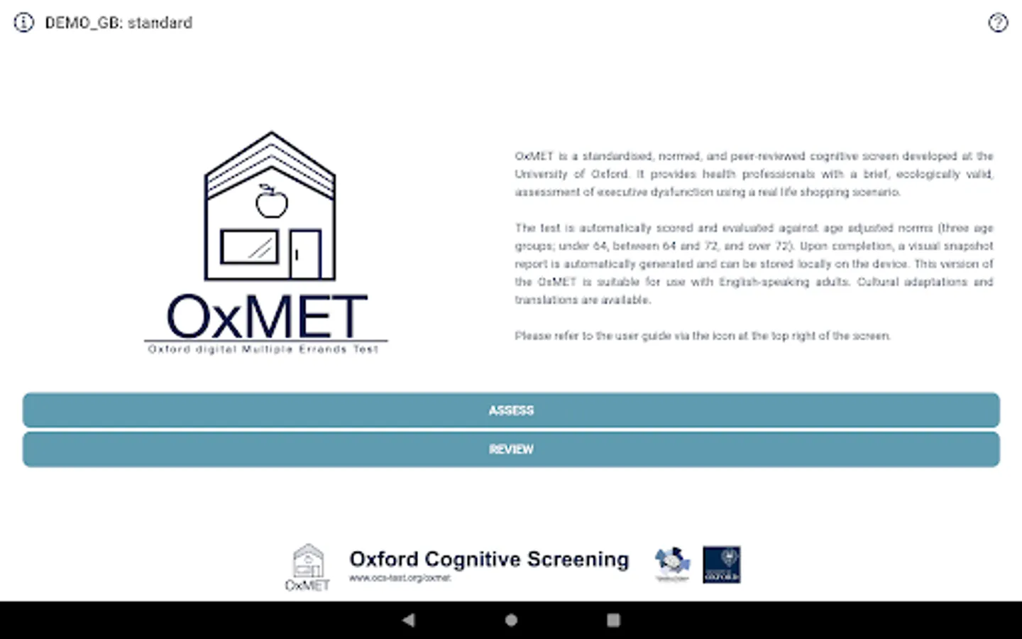 The tool is not for self-assessment. Instead, OxMET provides health professionals with a brief, ecologically valid, assessment of executive dysfunction using a naturalistic shopping scenario. The test is automatically scored and evaluated against age adjusted norms (three age groups; under 64, between 64 and 72, and over 72). Upon completion, a visual snapshot report is automatically generated and can be stored locally on the device. The information contained in the report is not in itself a clinical diagnosis. The report should be used to inform a clinical diagnosis that takes into account all relevant clinical factors.