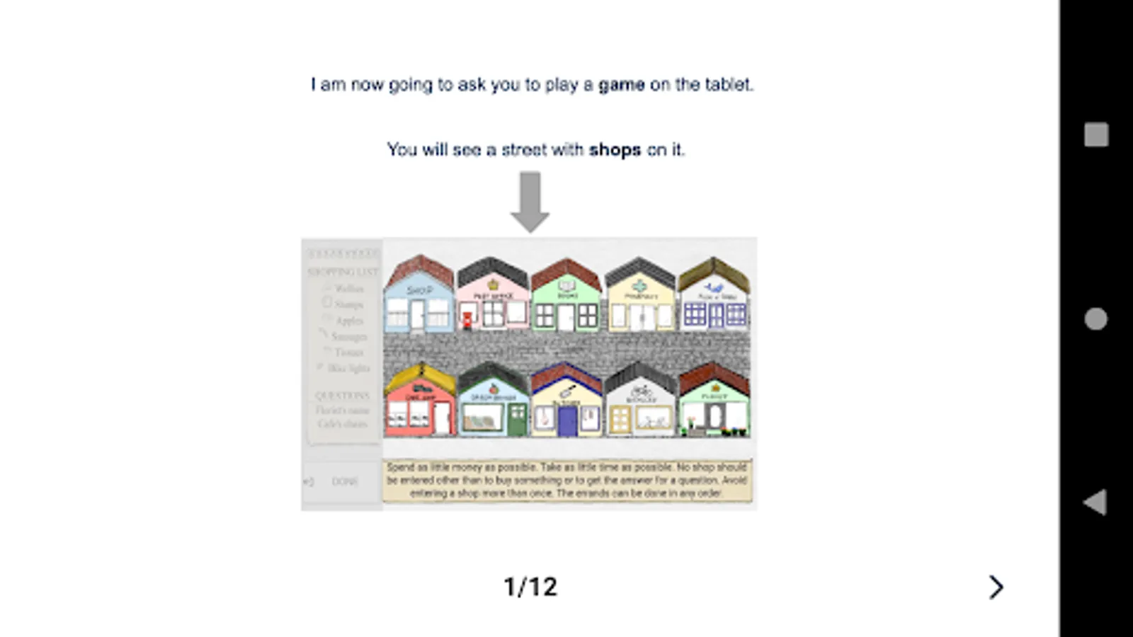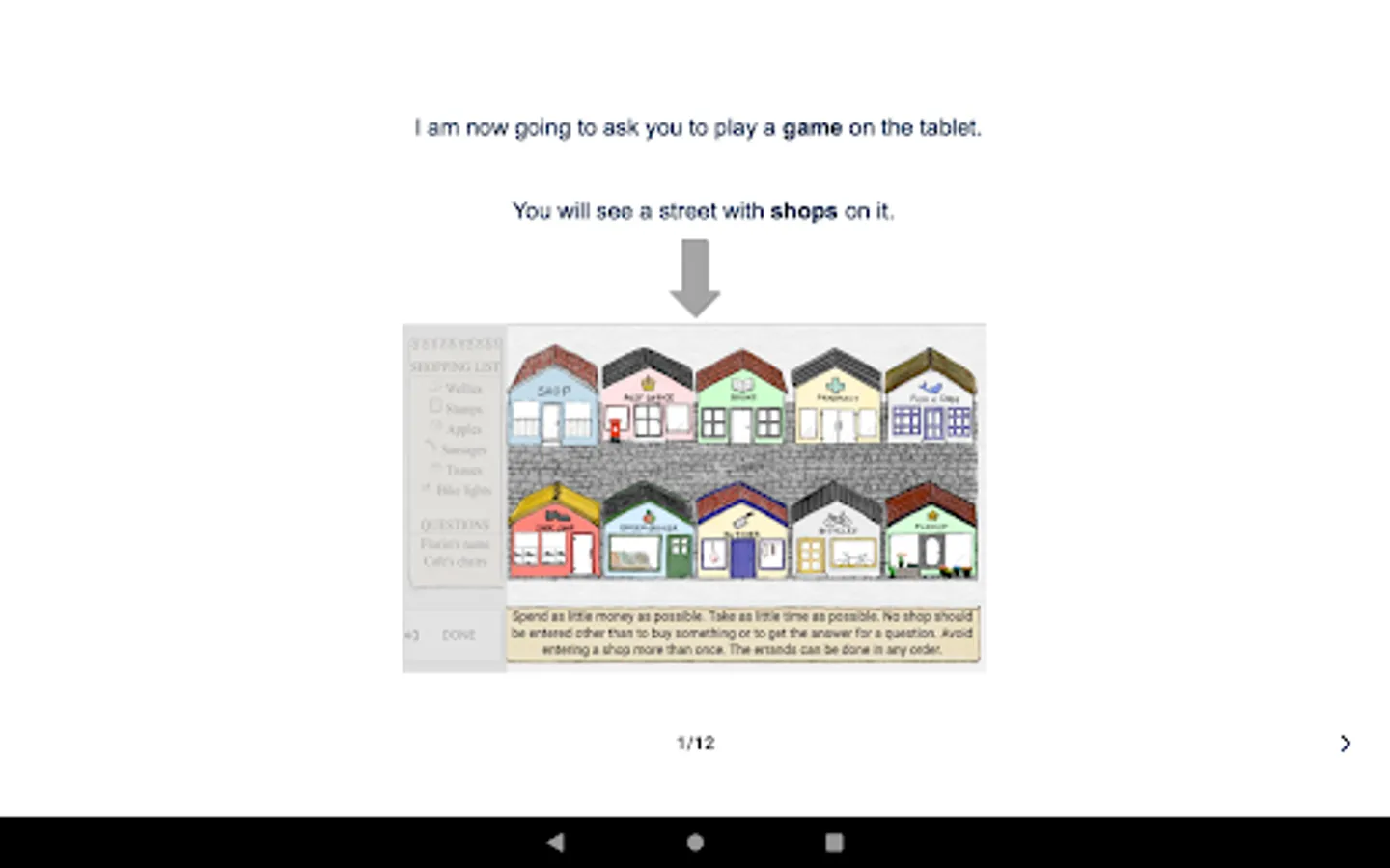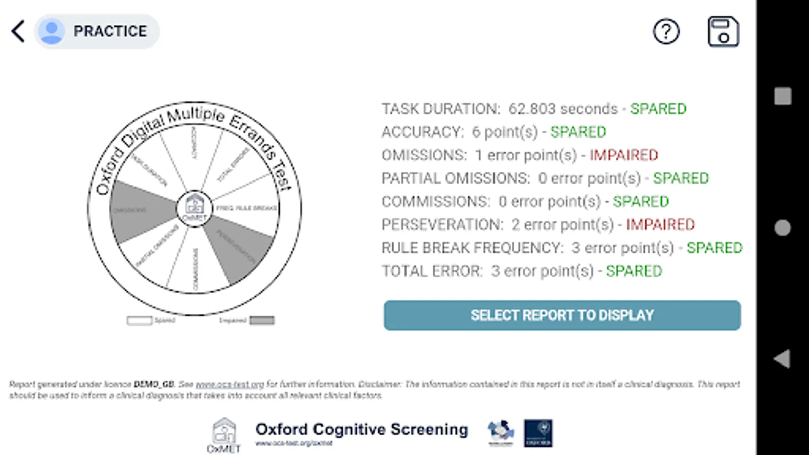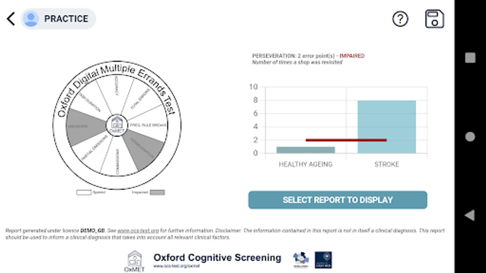 The tool is not for self-assessment. Instead, OxMET provides health professionals with a brief, ecologically valid, assessment of executive dysfunction using a naturalistic shopping scenario. The test is automatically scored and evaluated against age adjusted norms (three age groups; under 64, between 64 and 72, and over 72). Upon completion, a visual snapshot report is automatically generated and can be stored locally on the device. The information contained in the report is not in itself a clinical diagnosis. The report should be used to inform a clinical diagnosis that takes into account all relevant clinical factors.