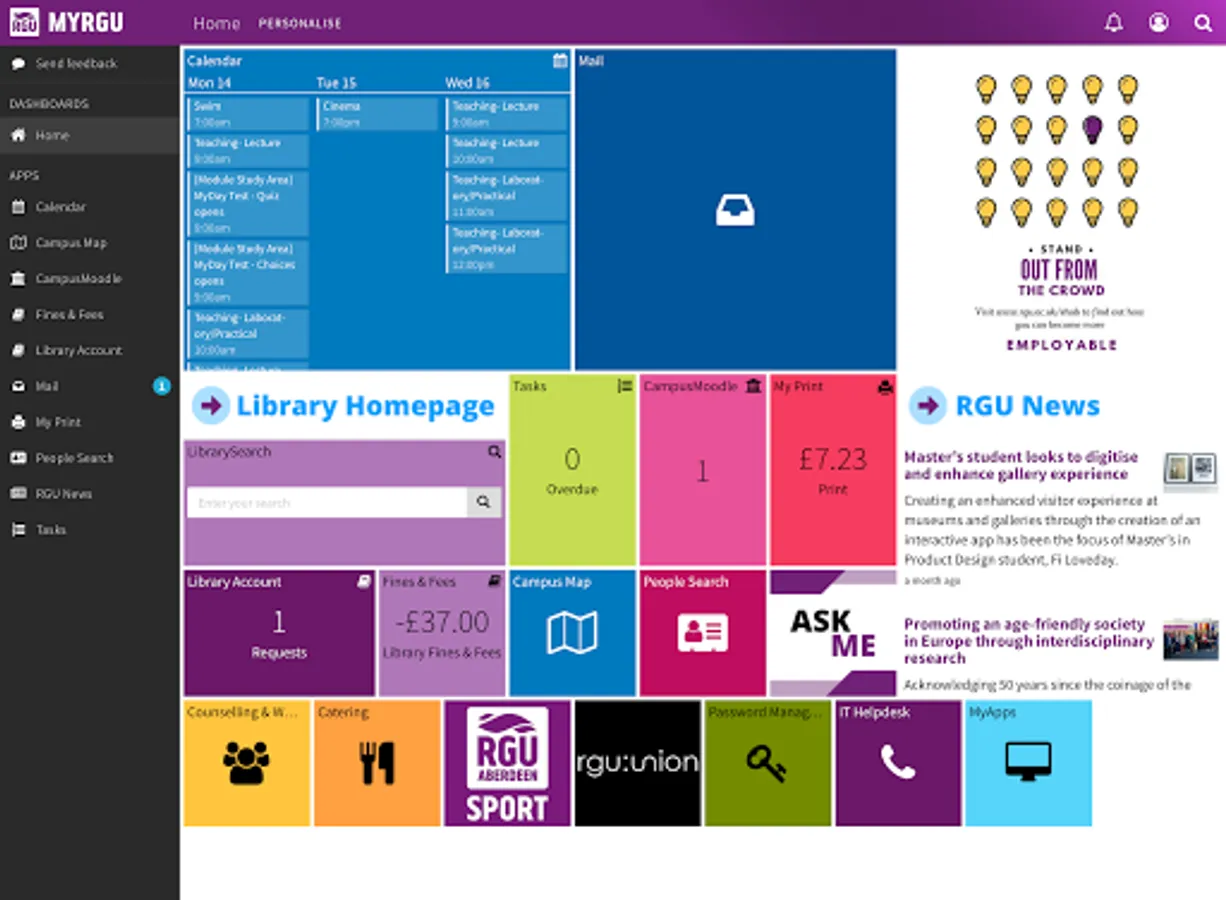 The MYRGU app also synchronises with the web based desktop site, providing access to the same apps and data for a seamless experience. Plus any changes you make to the mobile dashboard on your desktop will be synced to the mobile app to make personalisation quick and easy.