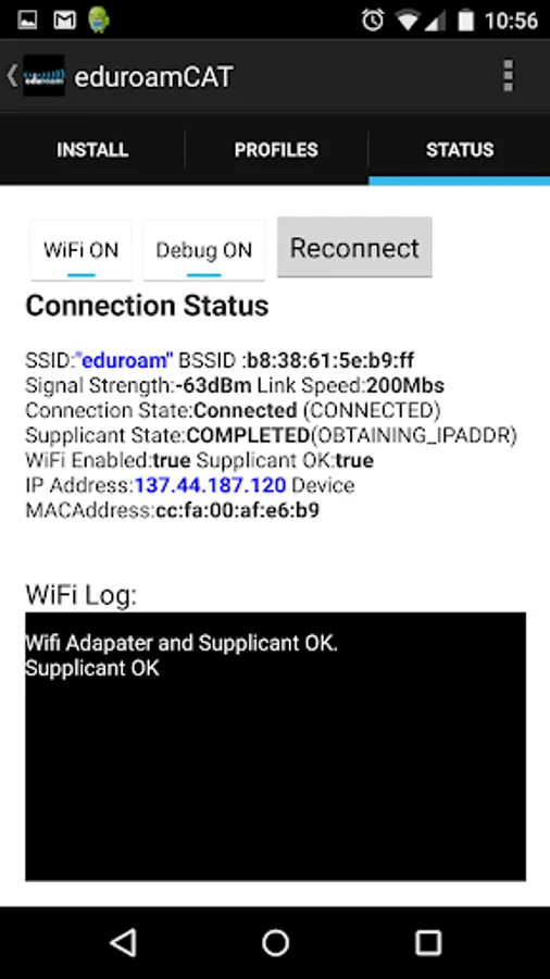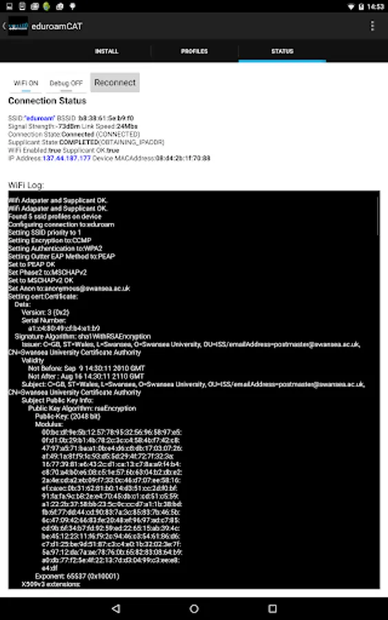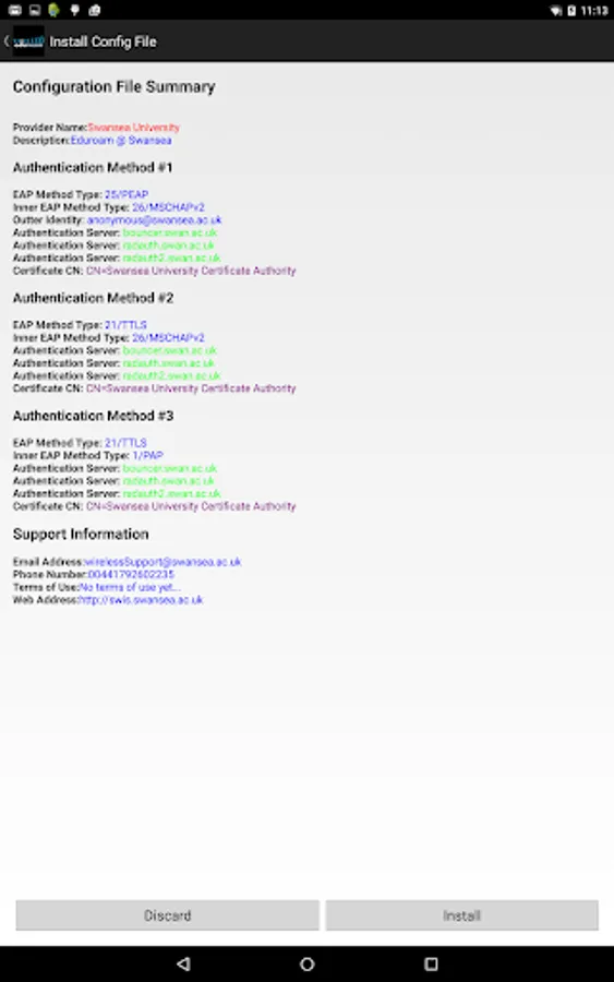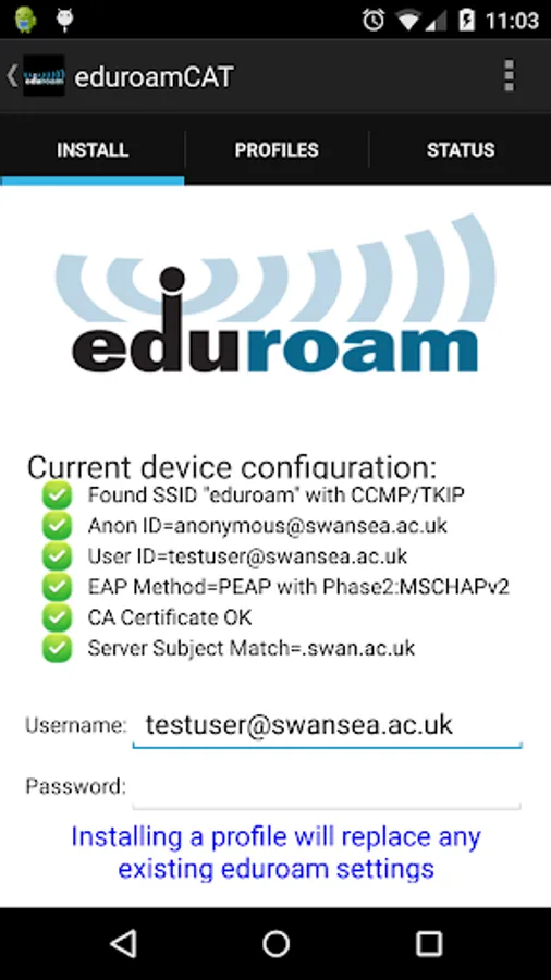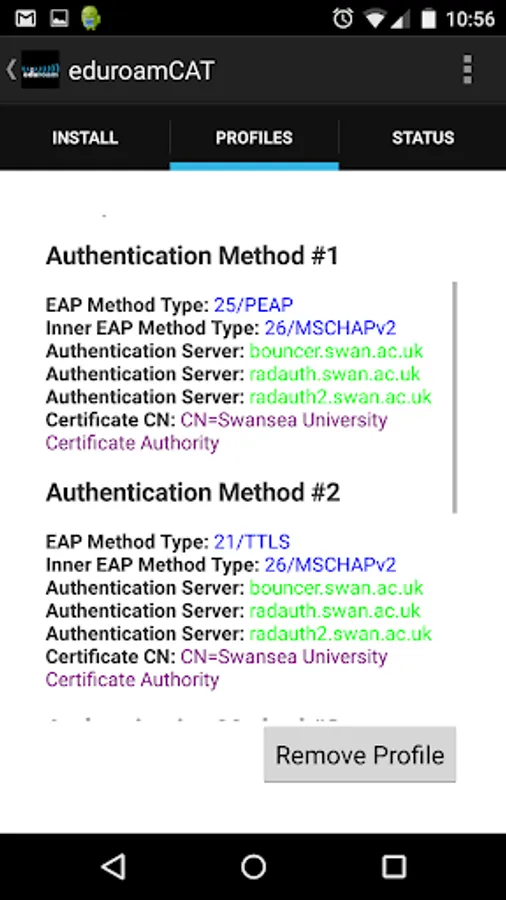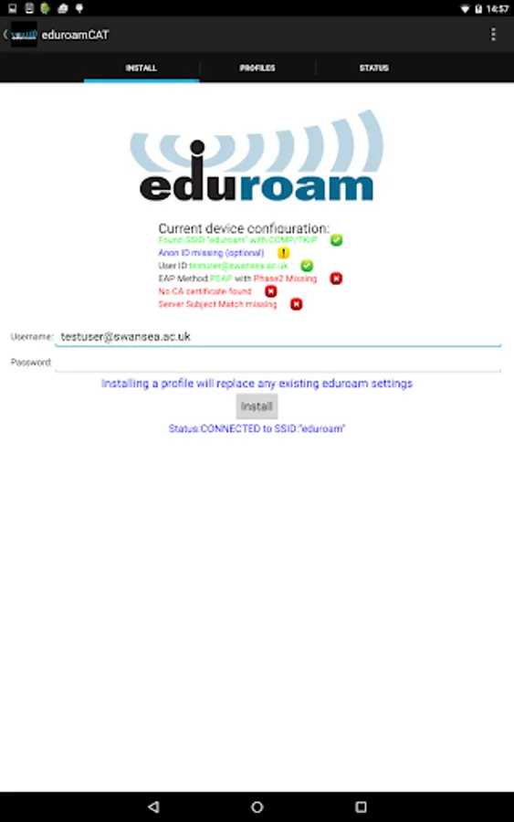 A tool to allow users to configure their device for eduroam wireless networks. This tool requires a configuration file from your home institution in order acquire the configuration settings needed. Due to limitations in the Android OS, the application needs to set up a screen lock if none is already set. The configuration file is in a standardised file format and can be obtained from eduroam Configuration Assistant Tool deployments (such as https://cat.eduroam.org and others). The tool also provides some status information on the eduroam connection.