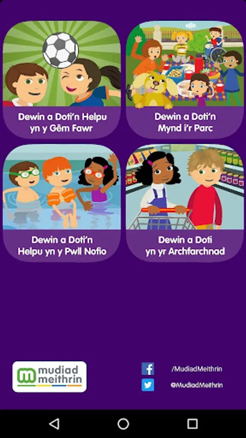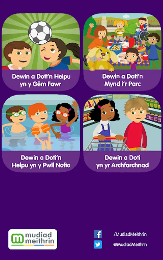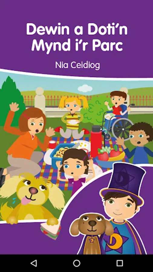 Here is an App for children between 2 – 5 years old that includes 4 audio books featuring Dewin and Doti – Mudiad Meithrin’s unique characters, written and read by Nia Ceidiog (the author of Fireman Sam). The stories reflect the everyday lives of young children in Wales – in all their diversity – combined with the magic of those two lovely characters Dewin and Doti. The titles of the books are Dewin a Doti yn yr Archfarchnad, (Dewin and Doti in the Supermarket) Dewin a Doti’n Helpu yn y Gêm Fawr (Dewin and Doti Help in the Big Game,) Dewin a Doti’n Helpu yn y Pwll Nofio (Dewin and Doti Help in the Swimming Pool), and Dewin a Doti’n Mynd i’r Parc (Dewin and Doti go to the Park).