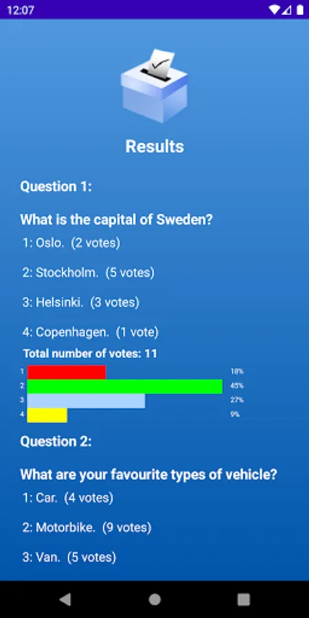 The results to a finished election can then be viewed as bar charts or text depending on the format of each question.