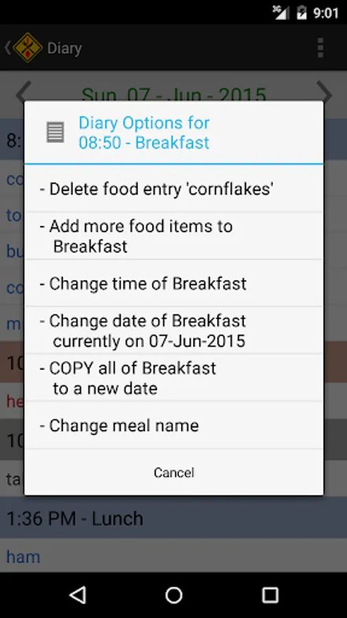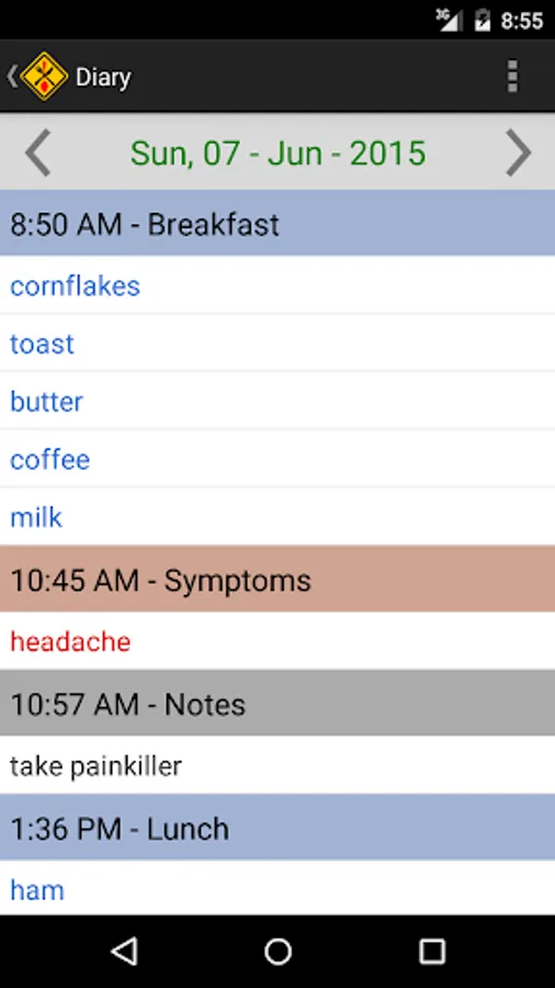 The heart of the app is a diary in which you can record all the individual food items that you eat for each meal of the day. In addition you can also record any symptoms you experience which may be caused by some of these food items. The exact time and date is recorded for each entry, to build up a comprehensive picture of your diet and symptoms on an hour by hour, day by day basis. Any other information you wish to record can be entered as "Notes" in to the diary.