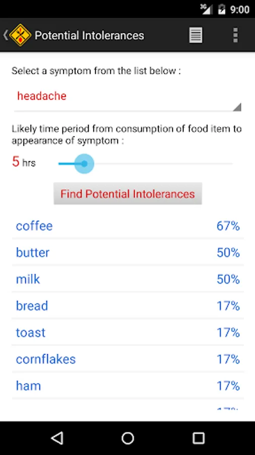 Once you have recorded a useful amount of data on your food consumption and symptoms, the app is able to perform a statistical analysis on this information and then give an indication of which food items might be the most likely cause of a specific symptom you are experiencing (the app disregards any notes you have entered). In addition you can look for foods which, after consumption, may have either a short or a long "incubation period" before causing a noticeable symptom. This can be done by adjusting a simple slider to influence how the statistical analysis looks at the data. It should be noted that the information provided in this app does not constitute medical advice. You should always consult with a medical professional before embarking on any course of action which may affect your health.