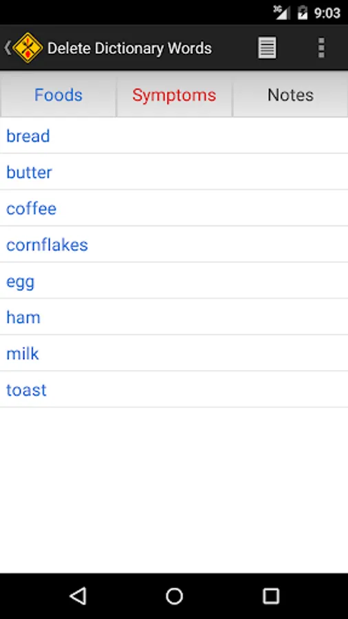 Entering the information is easy because the Intolerance Food Diary remembers every food item, symptom, or note that you enter into the diary, so the next time you come to type in that same information it appears ready to select in a drop down list. This makes filling in the diary much quicker and more reliable.