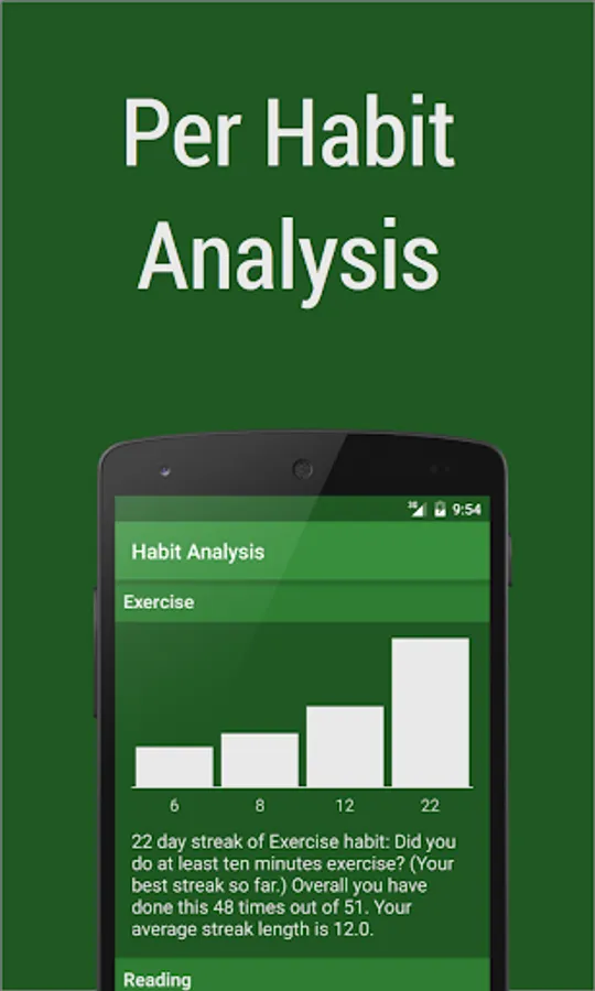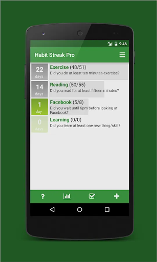 ✓ Habit Streak helps you achieve your goals (or New Year's Resolutions) in exercise, diet or other areas of your life. Each day you report on whether you succeeded yesterday, building up streaks of habits and ingraining the activities into your life.