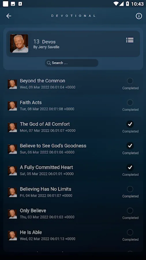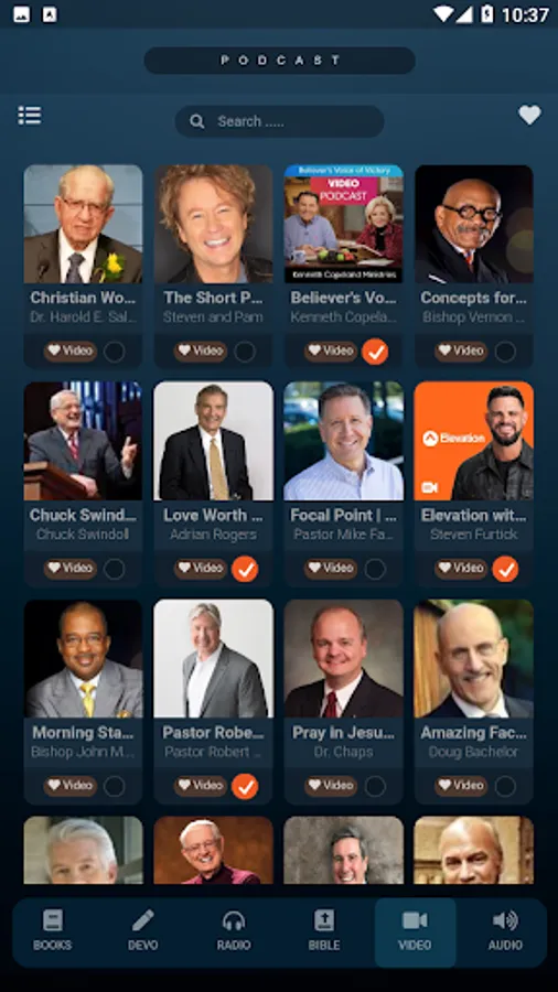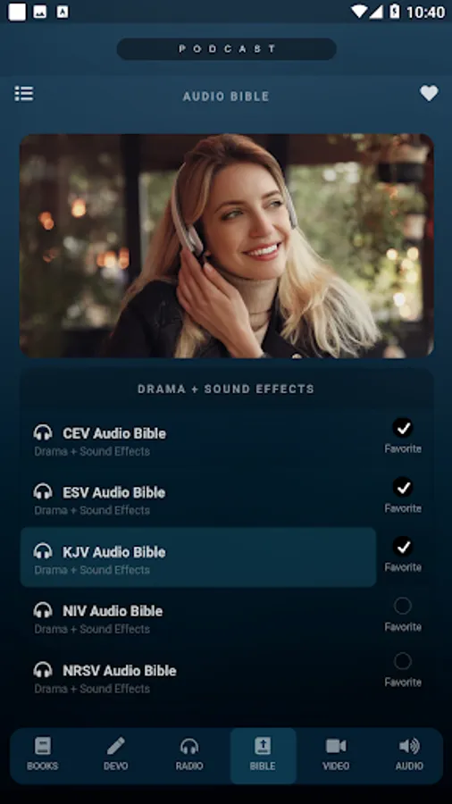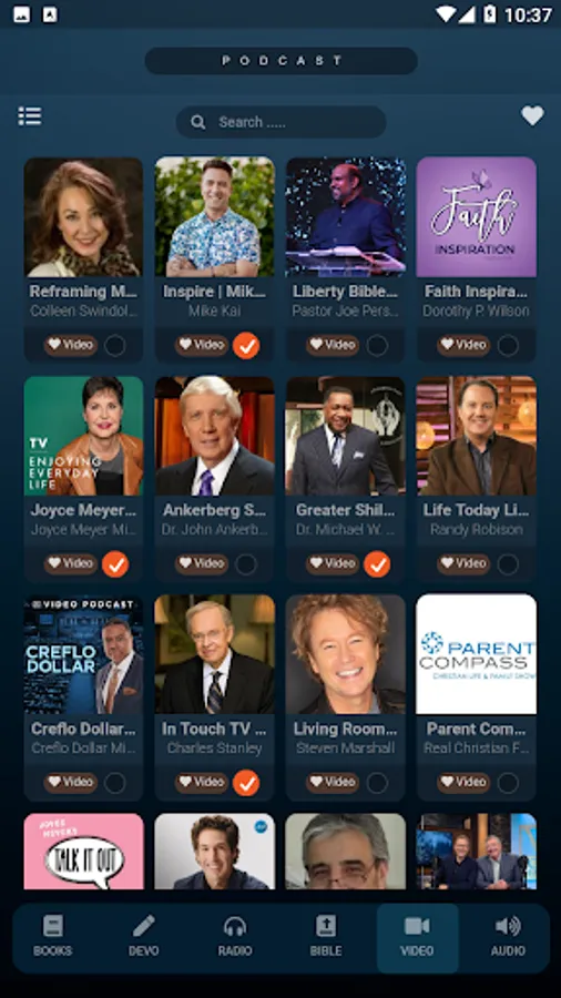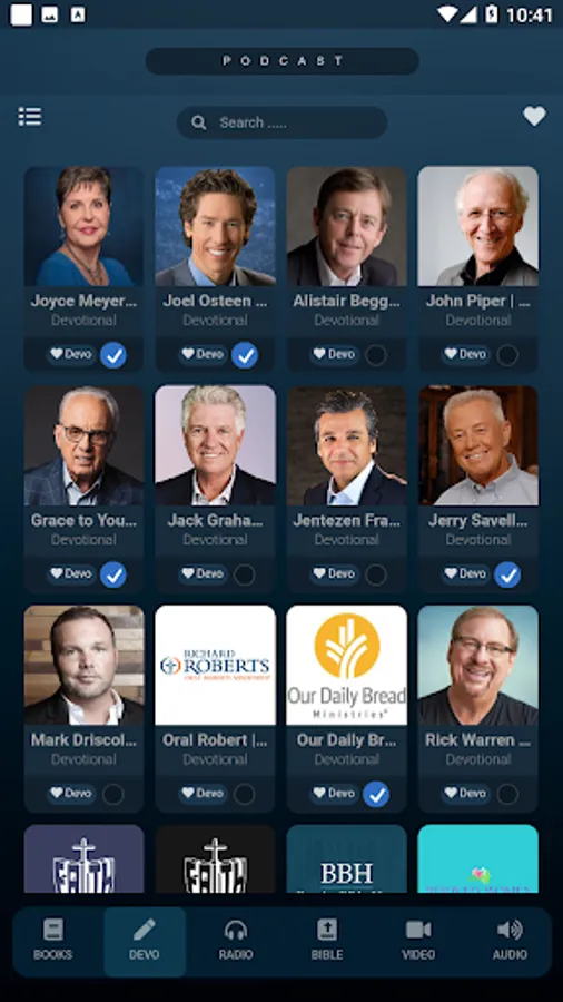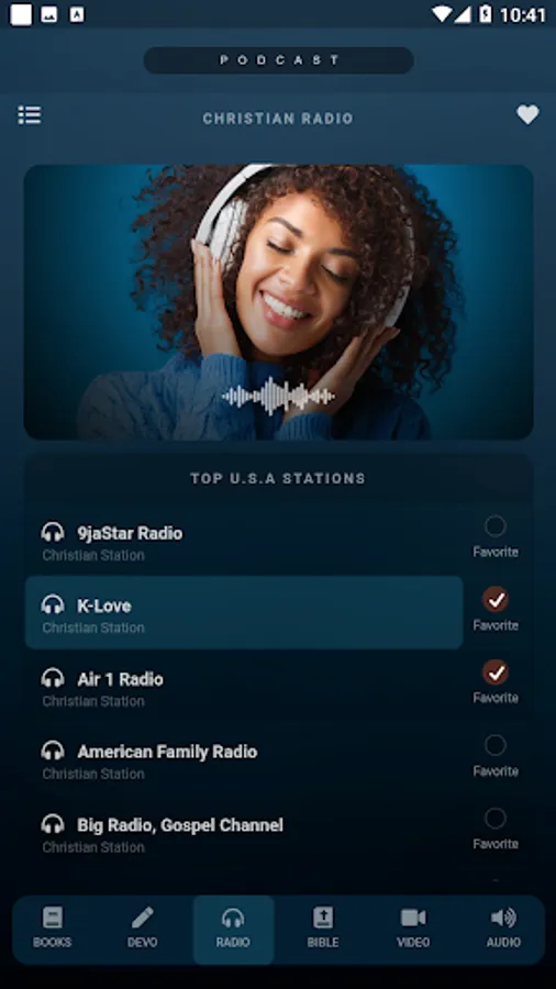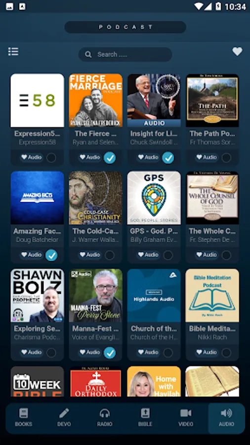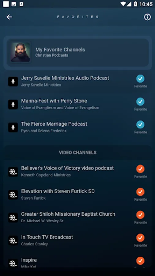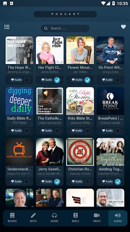 Use the provided round checkboxes to add your favorite podcasts channels, audio books, devotionals, and radio stations to your favorite list.