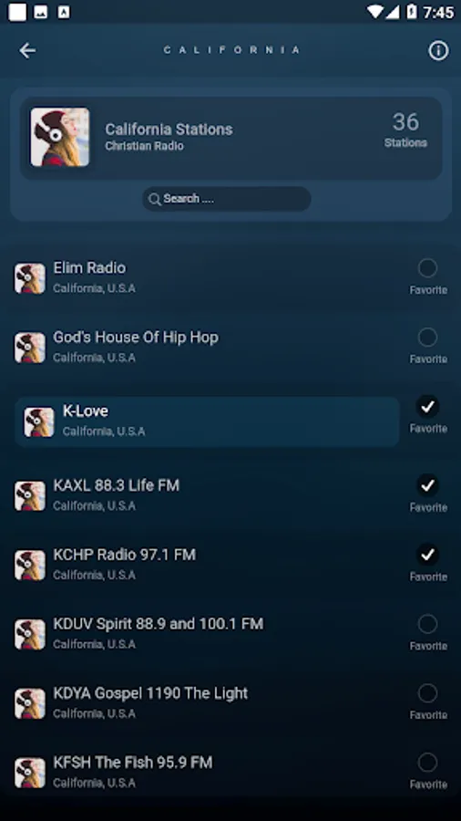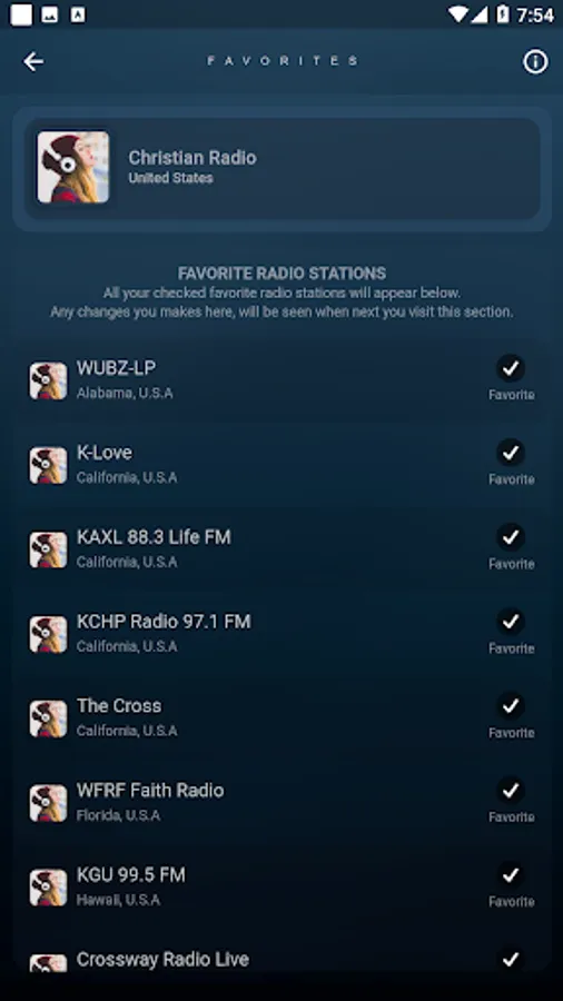 Use the provided round checkboxes to add your favourite radio stations to your favourite list.