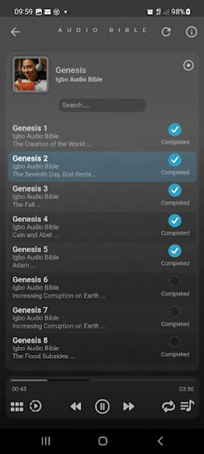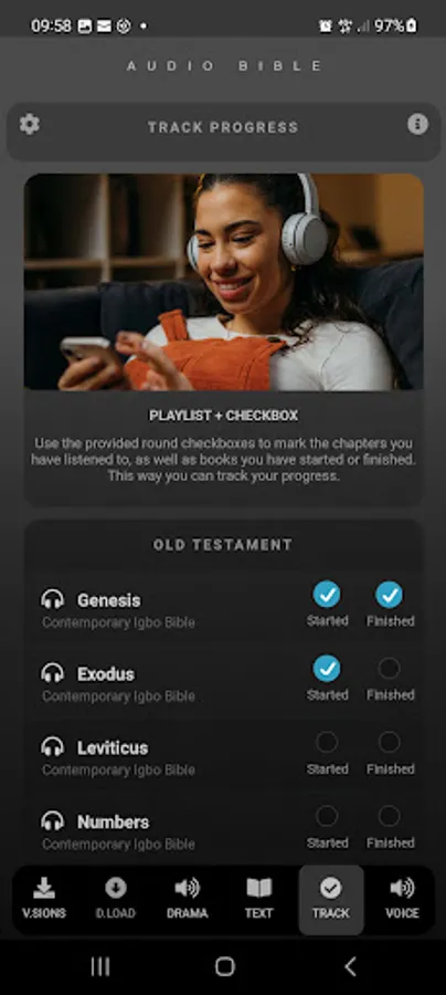 Use the provided round checkboxes to track the books and chapters that you have listened to.