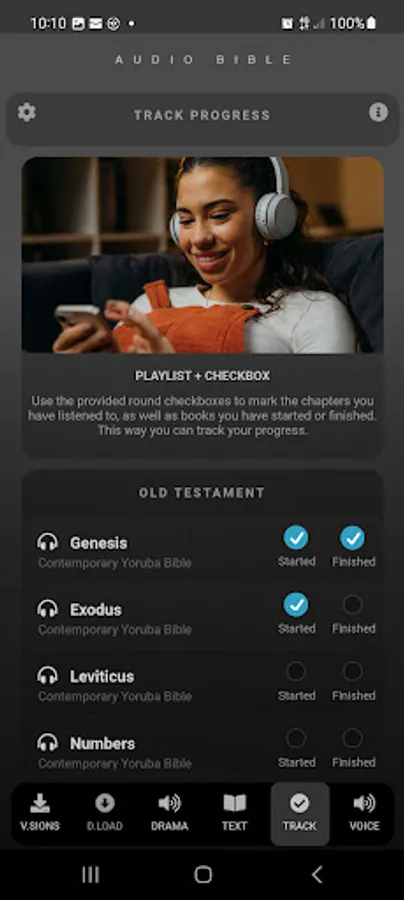 Use the provided round checkboxes to track the books and chapters that you have listened to.