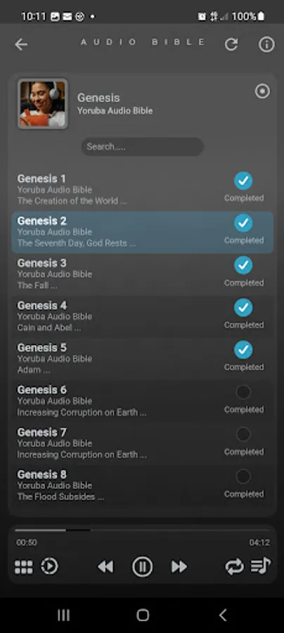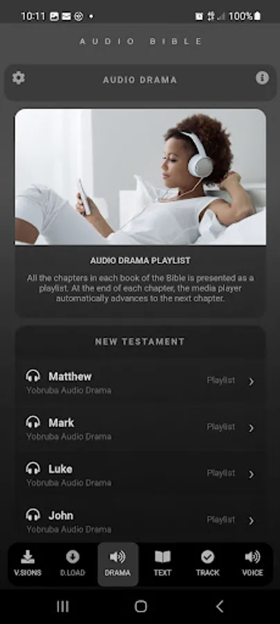 All the books and chapters of the Bible are presented as a playlist. At the end of each chapter, the media player automatically advances to the next chapter in the playlist. This auto-advance feature allows for continuous listening of all the chapters in a book.