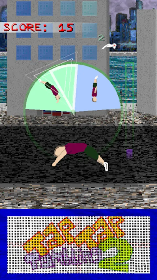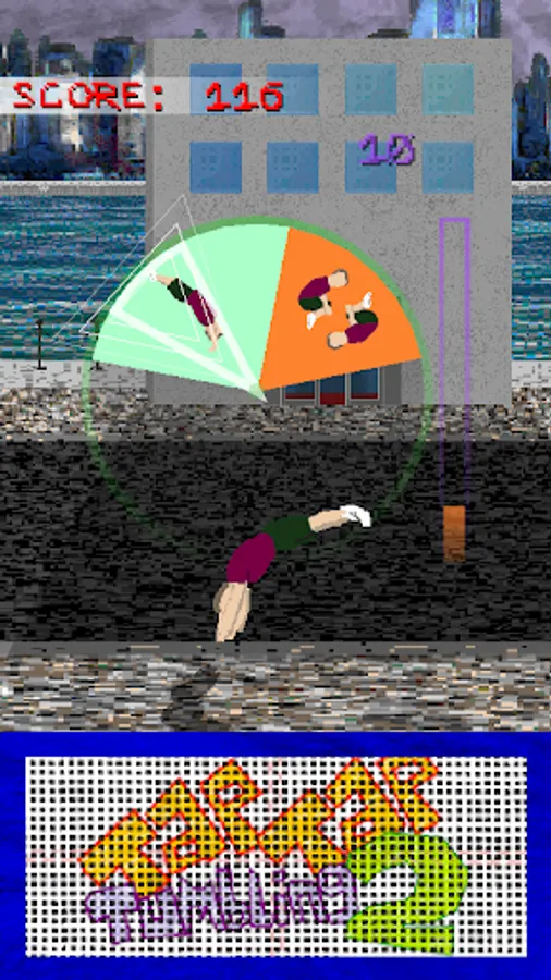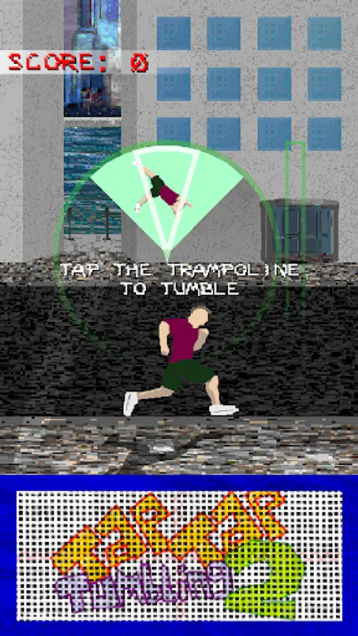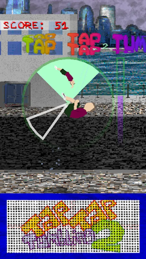 Tap Tap Tumbling 2 is a fast paced endless tumbling experience. Hit the trampoline in time with the dial to perform complex acrobatics. You play as an anonymous free-runner who fearlessly executes insane backflips, frontflips, and other flips, twists and tricks on the concrete streets. Try and get a high score, aim for a global top rank and see what else you can interact with along the way!