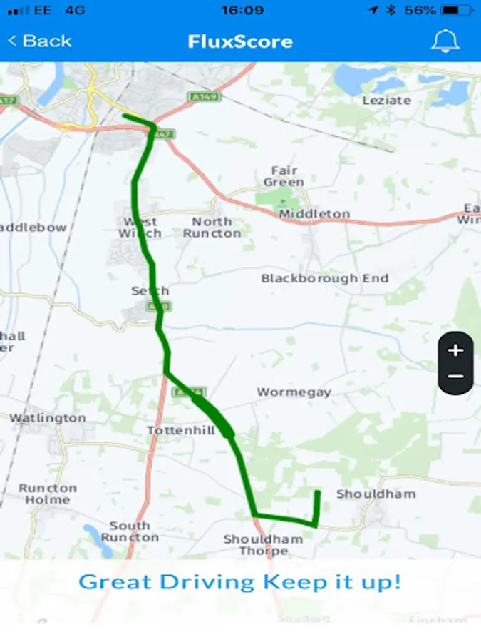 - Show your journeys for the previous 7 days with areas highlighted to show good, poor and dangerous driving.