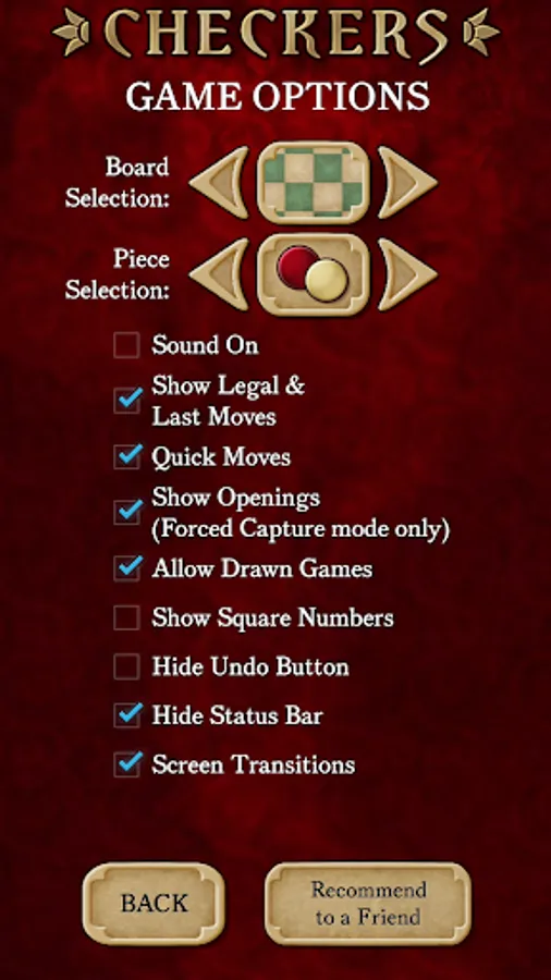 - Supports both non-compulsory captures (popular rules) and compulsory captures (official US/English rules)