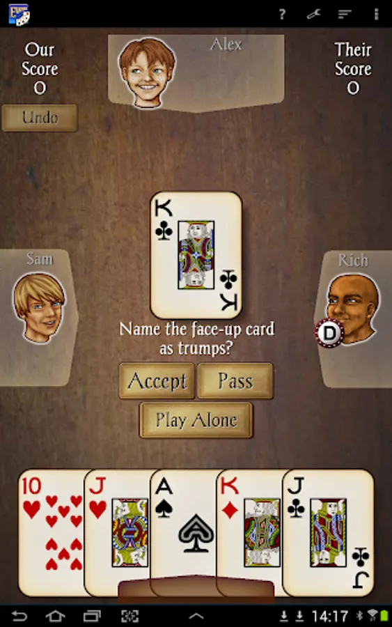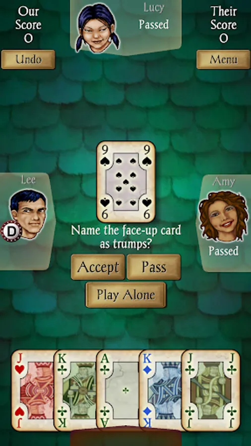 Euchre – the popular contract trick-taking card game for 4 players, brought to the Android market by AI Factory – is developed to the same high standard as the rest of our apps with an easy-to-use interface, smooth gameplay on all handsets, clear stylish graphics and individual CPU player “styles”. All you’ll ever need for Euchre!
