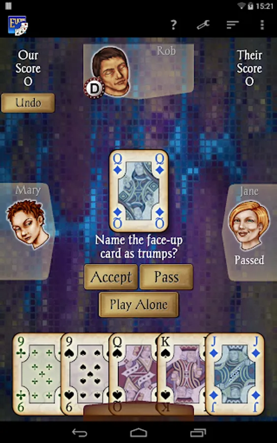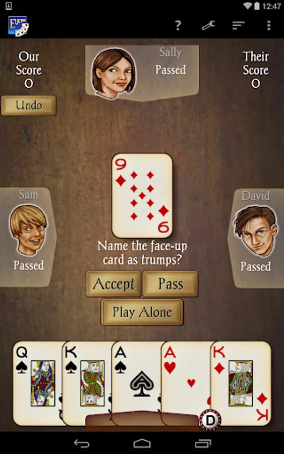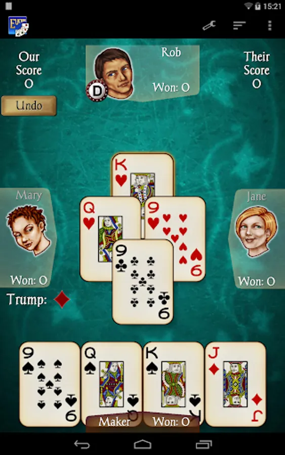 Euchre – the popular contract trick-taking card game for 4 players, brought to the Android market by AI Factory – is developed to the same high standard as the rest of our apps with an easy-to-use interface, smooth gameplay on all handsets, clear stylish graphics and individual CPU player “styles”. All you’ll ever need for Euchre!