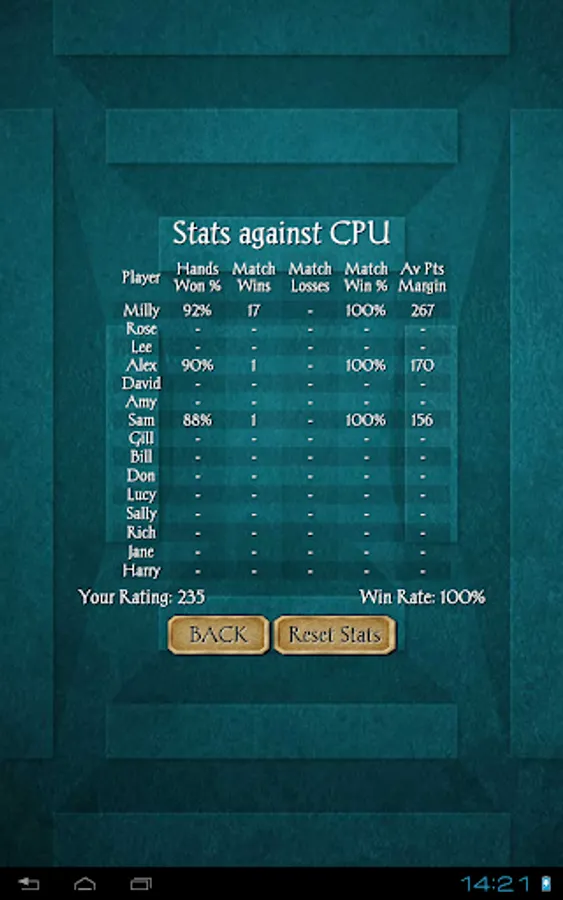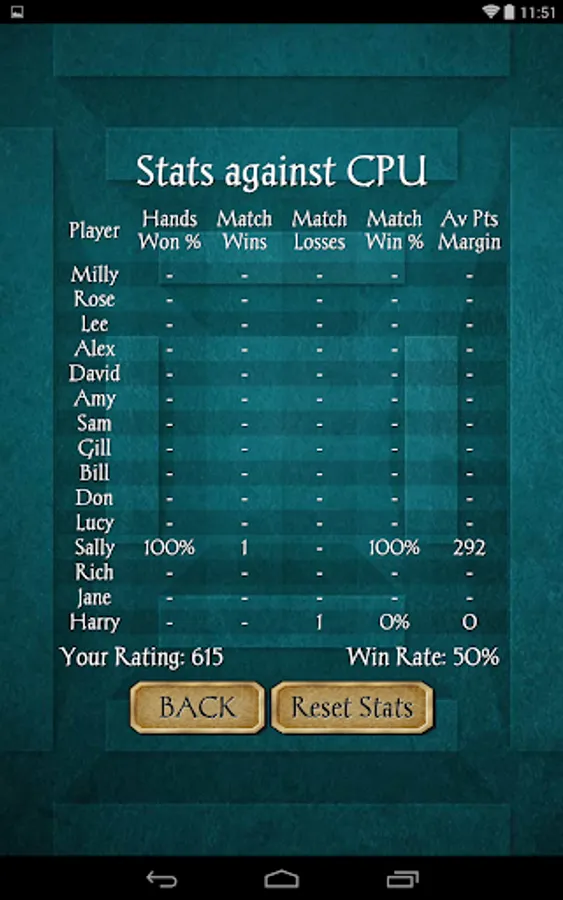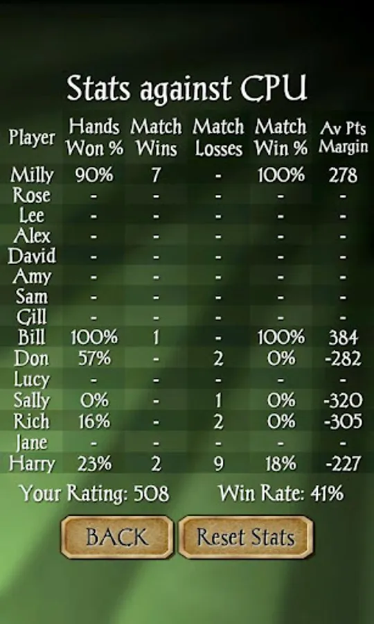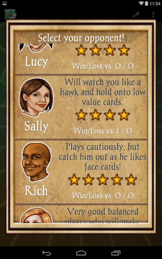 - 15 CPU Gin Rummy players of varying skills and styles (beginner to expert)