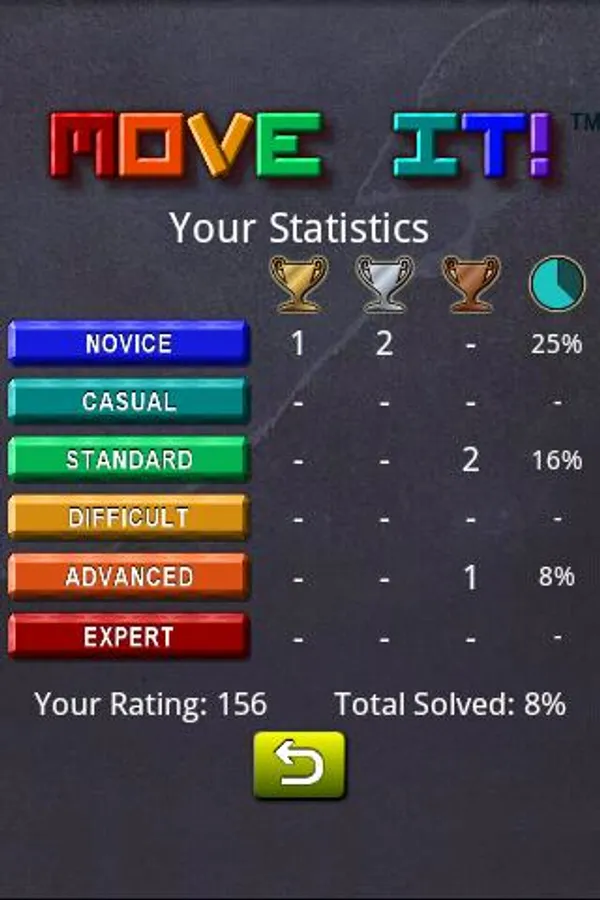The end product is a very natural game of great depth and variety, very well suited to the new generation of touch-screen devices. Move it! comes with 6 levels from Novice to Expert. Depending on level, it can be either a quick casual game or an extremely challenging puzzle.