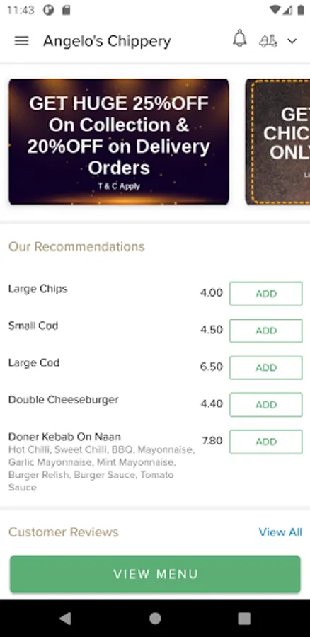 Order food online from one of the finest takeaways in town. Here at Angelo's Chippery in Leicester, and are proud to serve the surrounding area.Here at Angelo's Chippery, we serve a variety of food such as Fishcake, burgers, Bread, kebabs and more.You can find our whole menu on our app, filled with mouth-watering dishes and catering for all kinds of different tastes!