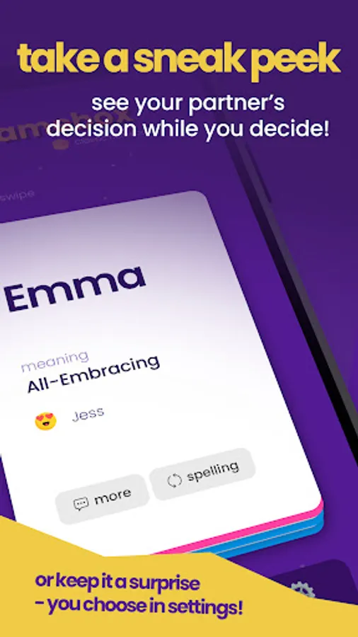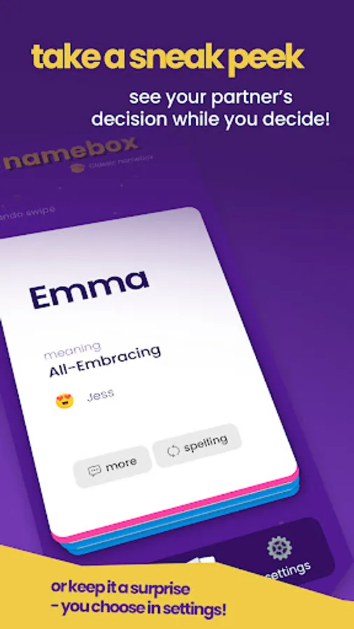 - PARTNER'S REACTIONS: see what your partner decided on the name before you do! (You can turn this off or on according to your preference)