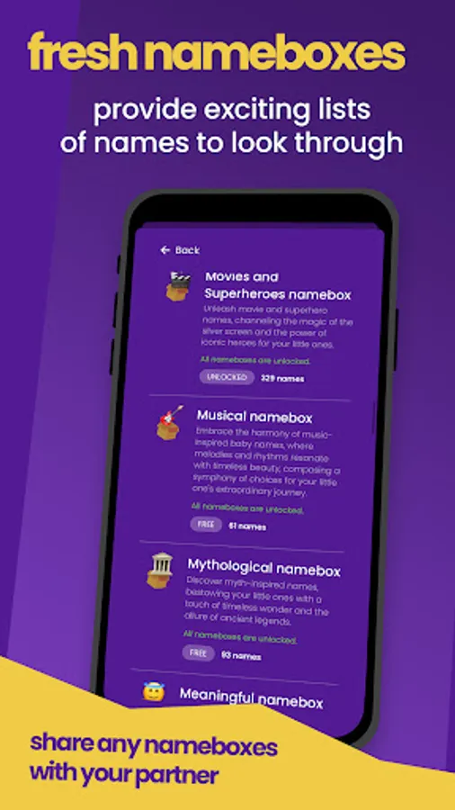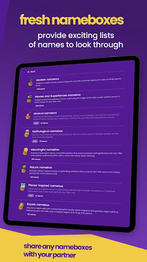 - SHARE PURCHASES WITH YOUR PARTNER: when you or your partner buy a namebox, you both have access to it! All adverts are removed for both of you once either of you makes a purchase.