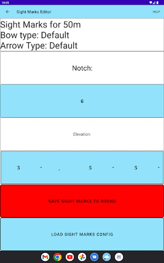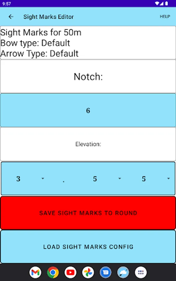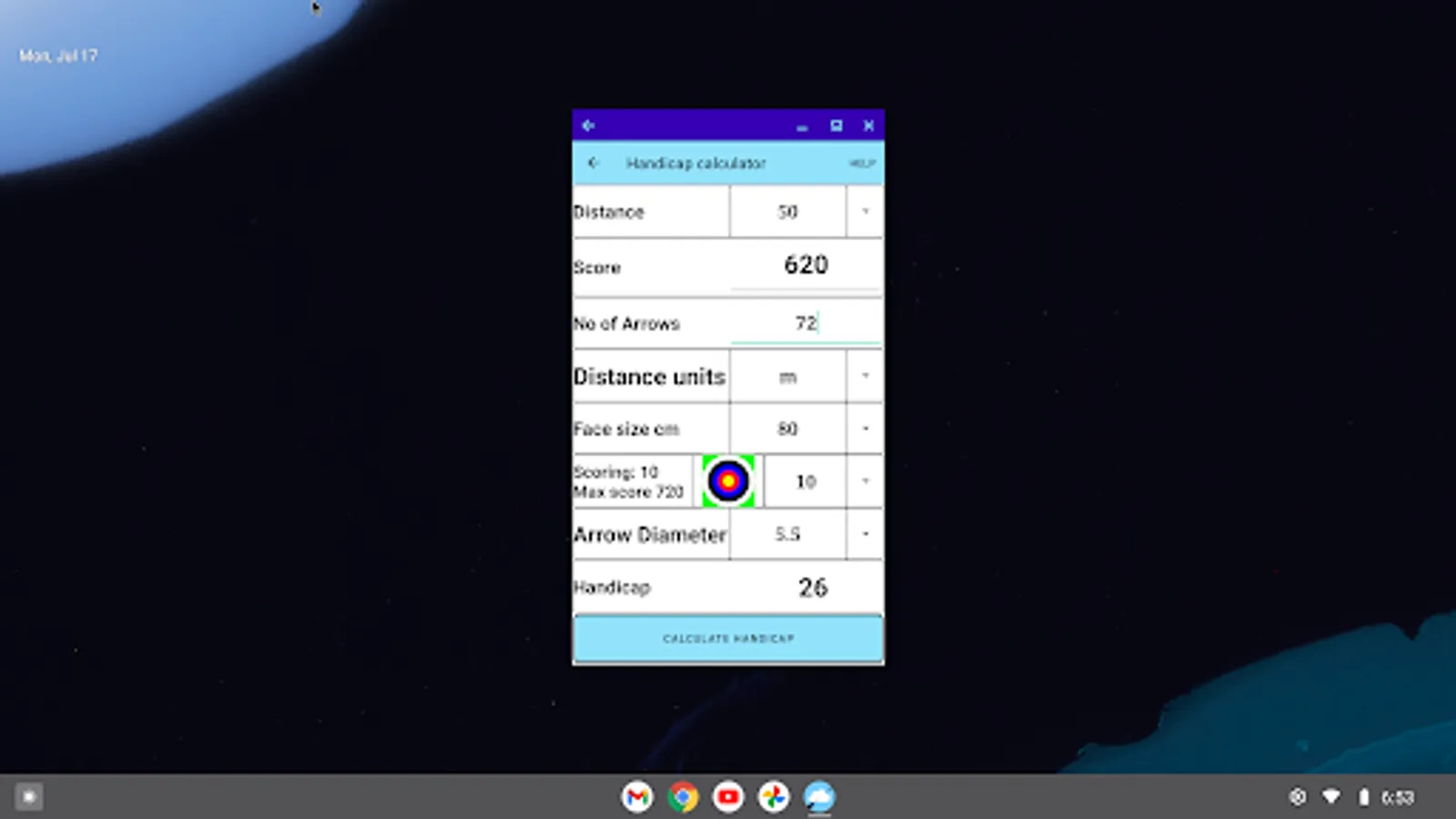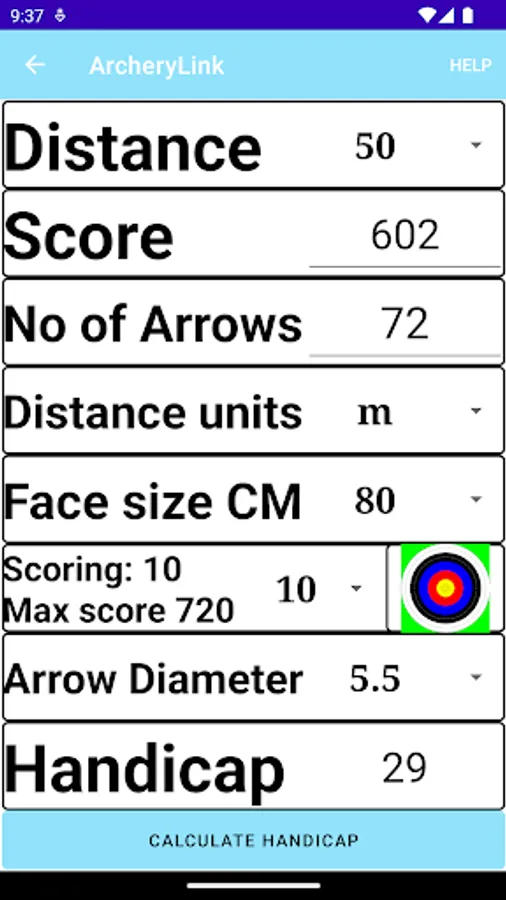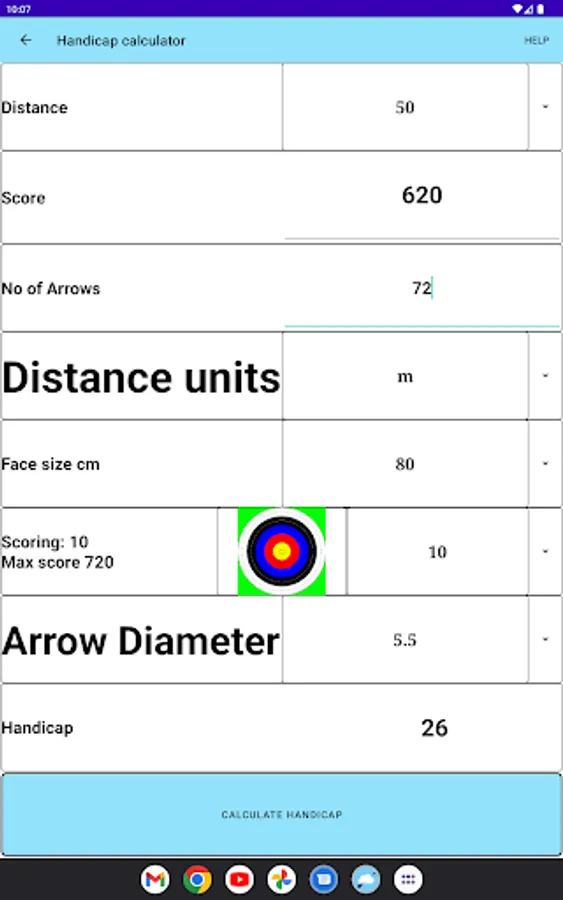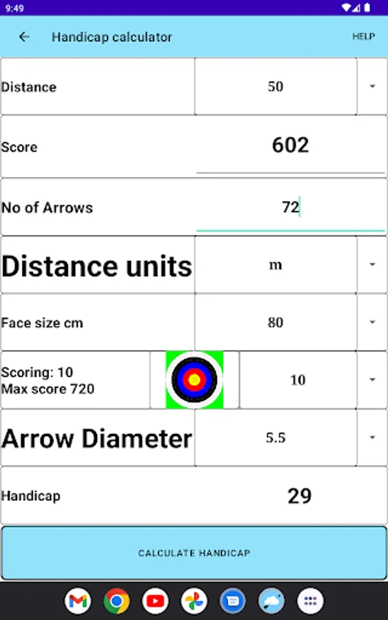 * Built in handicap calculator, select distance, face size, distance units, scoring (10,9,5,1), no arrows, arrow diameter shot and score.