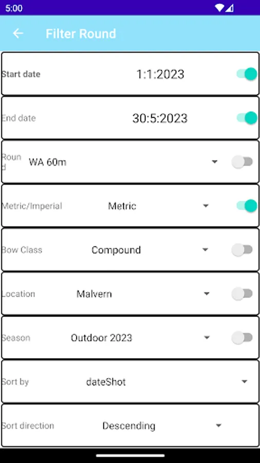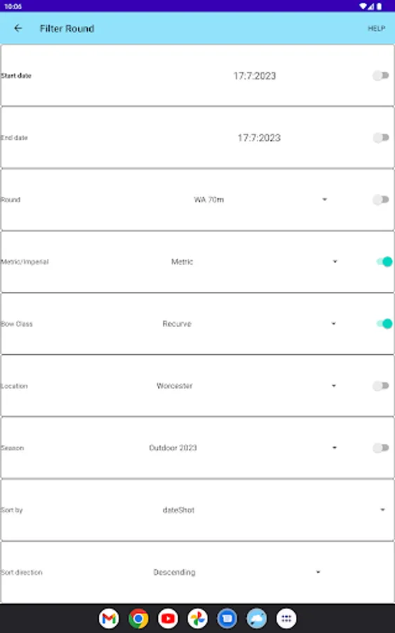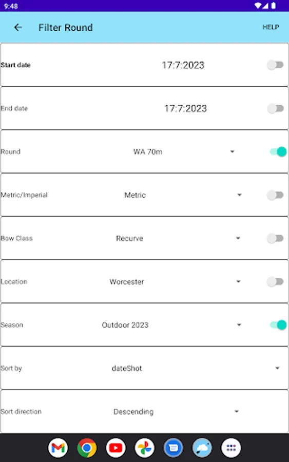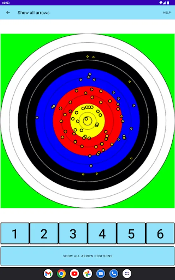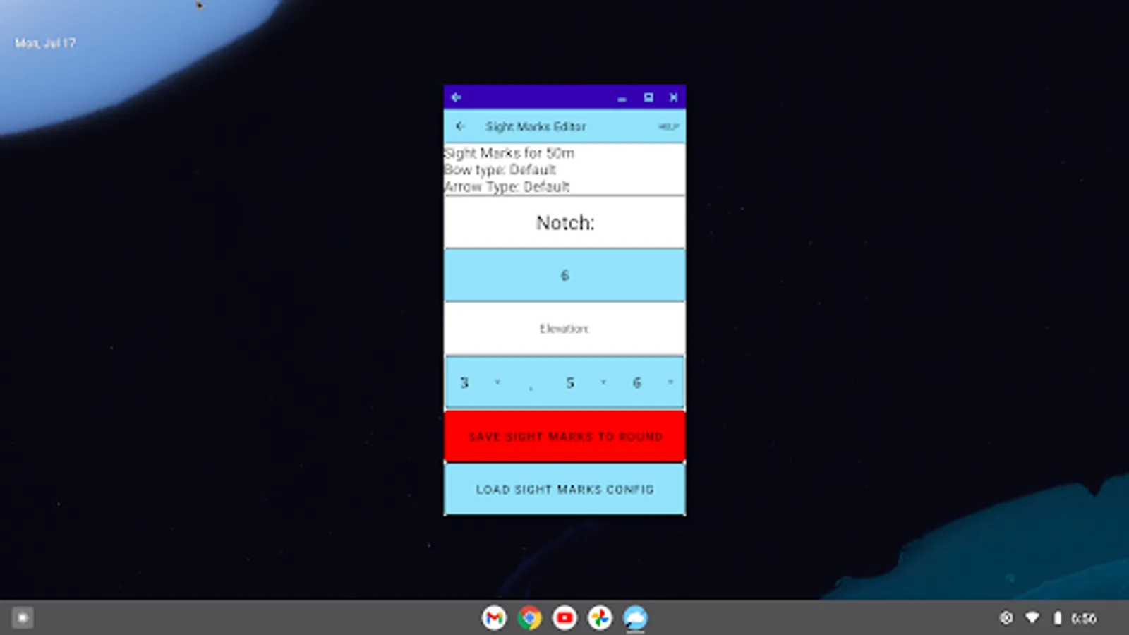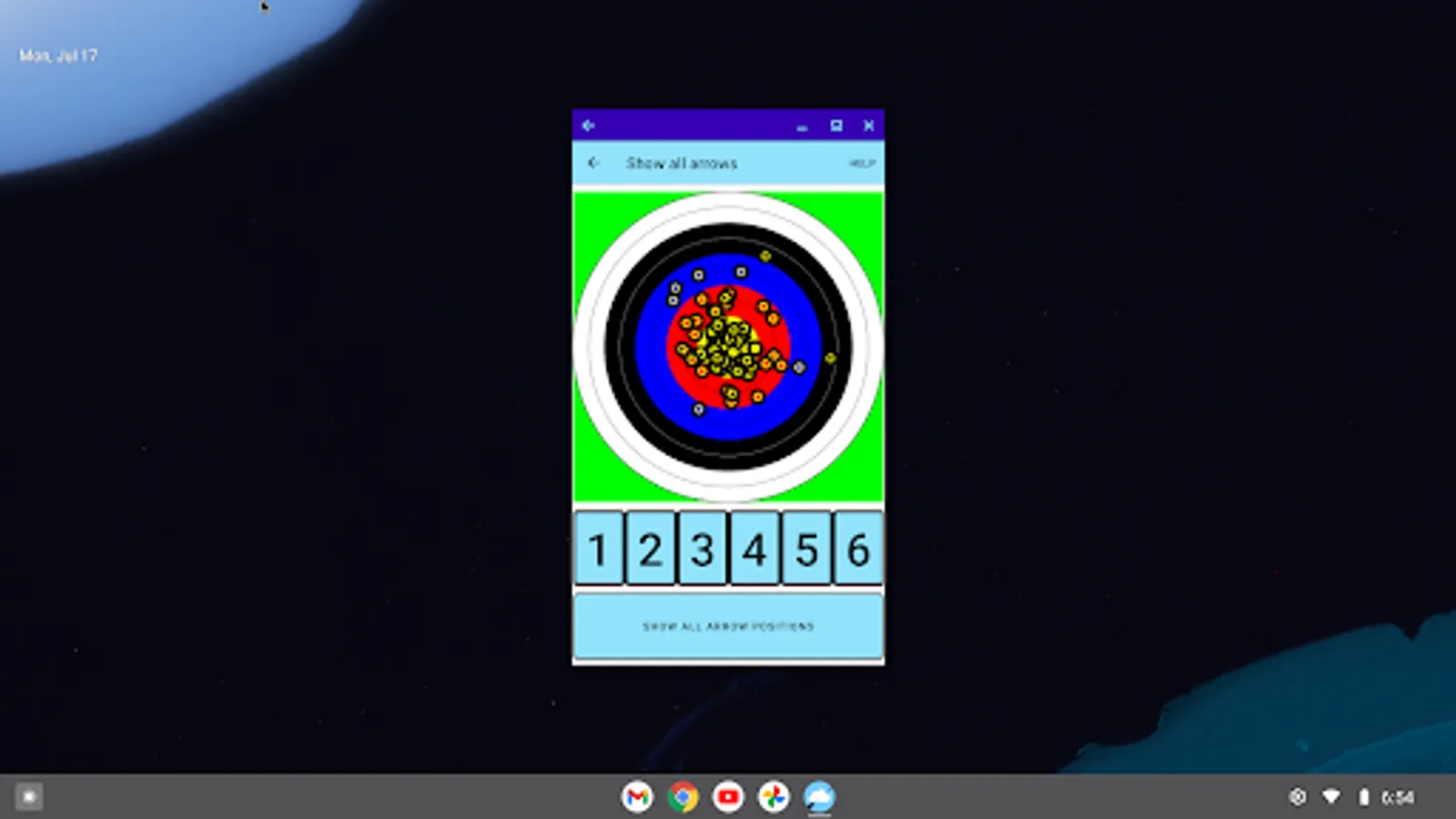 * Built in handicap calculator, select distance, face size, distance units, scoring (10,9,5,1), no arrows, arrow diameter shot and score.