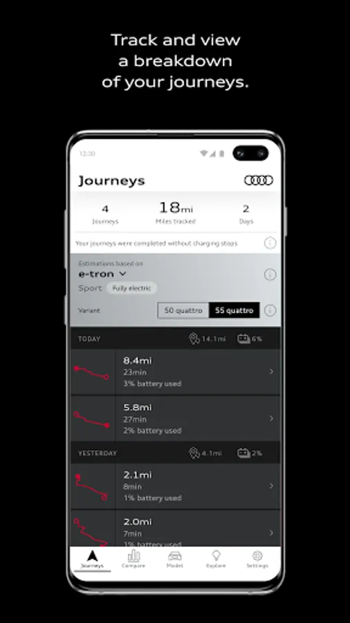 The unique comparison tool enables you to compare your running costs with the potential costs of driving any of the Audi fully electric or plug-in hybrid models available in the range. By answering a few simple questions, you can instantly see how much you could save. If you enable auto tracking, after six journeys the app will automatically switch to compare the savings with your actual journeys. The more trips you track, the more accurate the savings figure will be. And if you customise your own electricity and fuel costs, the figures will be even more precise.