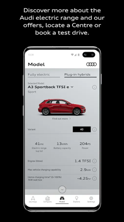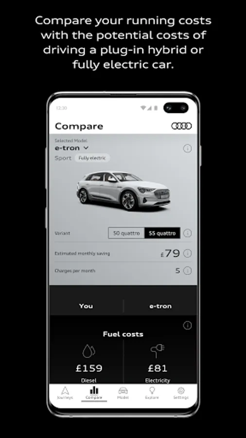 - Compare your current running costs with any of the Audi fully electric or plug-in hybrid models available in the range. For a more accurate fuel comparison, configure your fuel and electricity cost in the Settings tab.