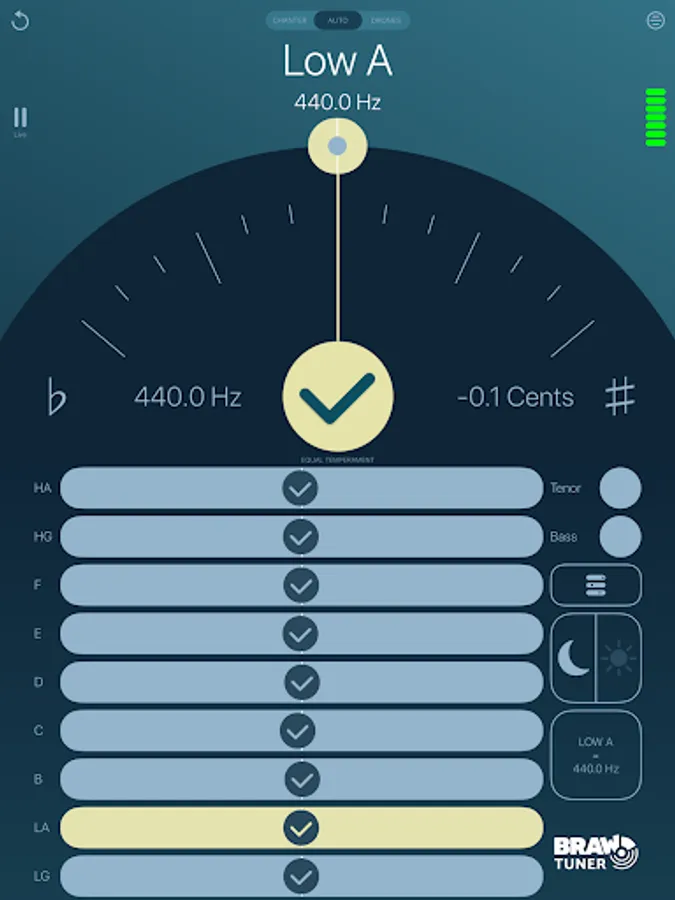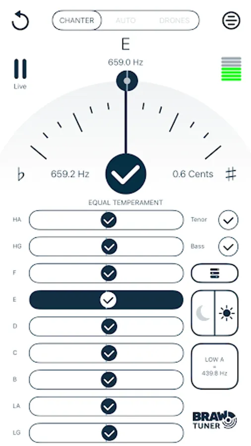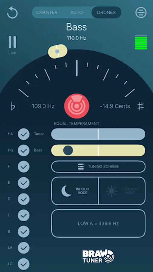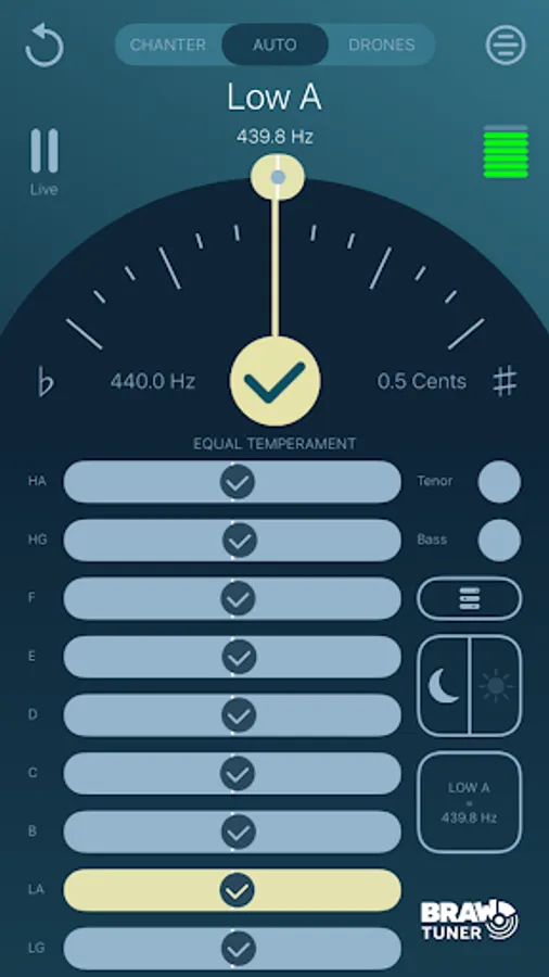 The tuner lets you tune your chanter and drones based on a reference Low A calibrated to your chanter.