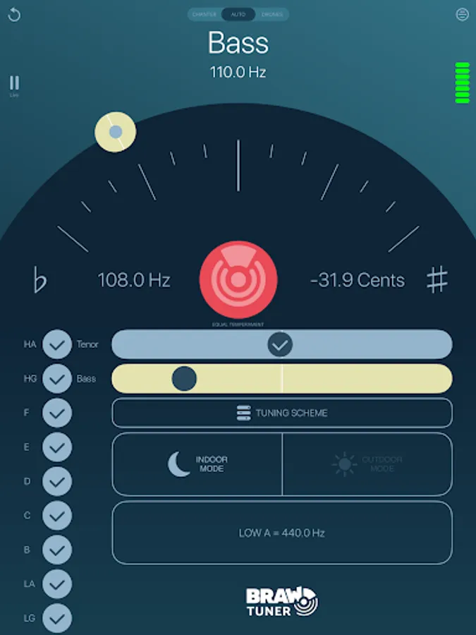 The tuner automatically detects which chanter note or drone note you are playing, based on what is the loudest/closest to your devices microphone. The gauge will then indicate how sharp or flat your chanter note or drones are, allowing you to tune them to achieve sweet sounding pipes.