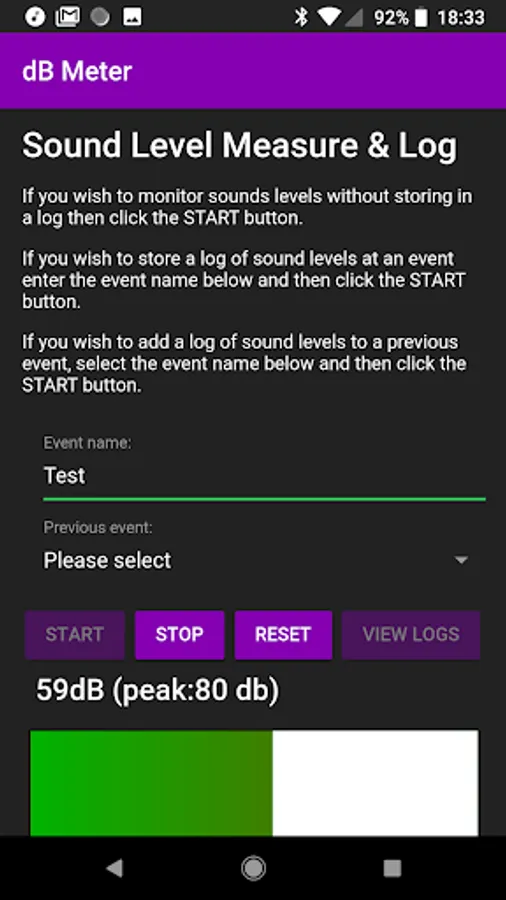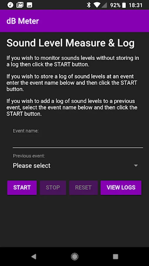 This app provides sound level monitoring with the capability to store a log of sound levels to a local database. Sound level logs can be reviewed to check peak levels with an adjustable threshold for flagging high levels. Further data can be recorded into an existing log or in a new log.