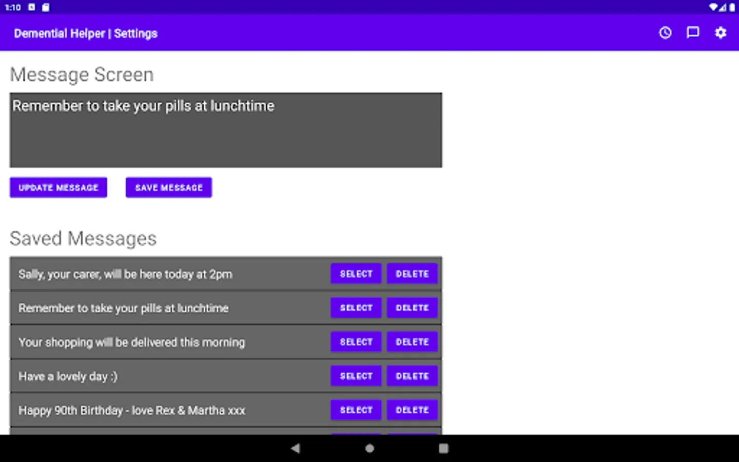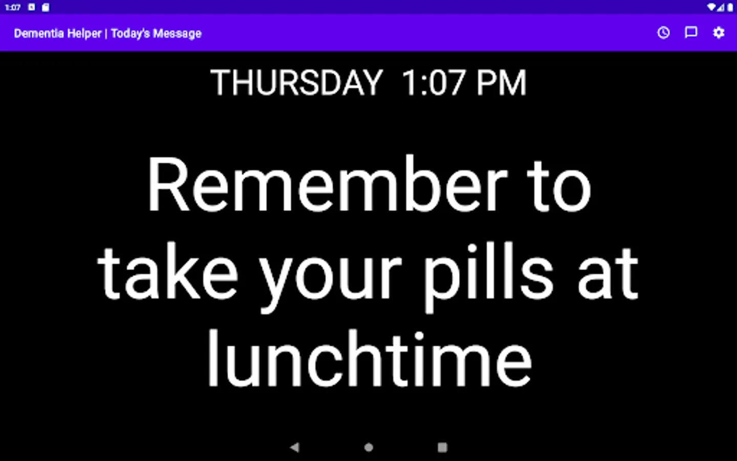 Dedicated Dementia clocks are expensive and limited in what facilities they offer. Instead, why not re-purpose a spare Android tablet to become a flexible dementia clock and messaging system. with the aid of this app. A dementia clock that can develop and become ever more useful as time goes by.