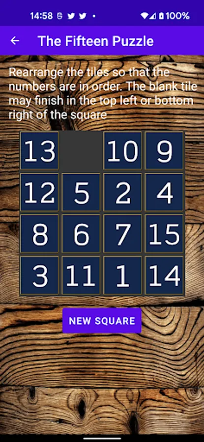 The App also includes a "Fifteen Puzzle" where you have a 4 x 4 grid and 15 numbers. You move numbers about by manipulating a blank square until you can get all the numbers in numerical order.