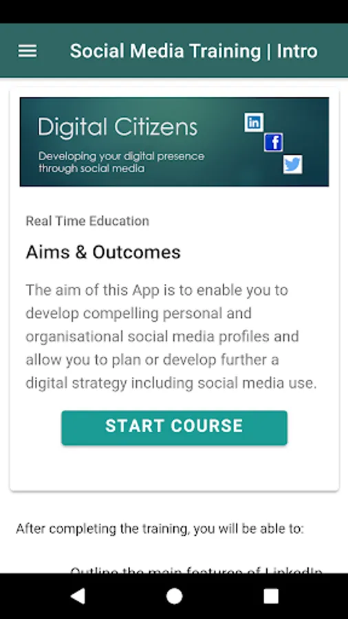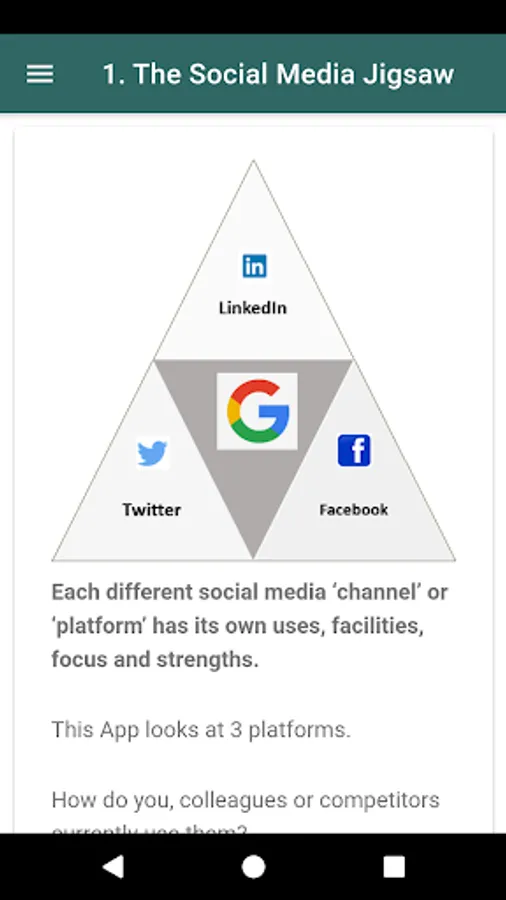 The App covers use of LinkedIn, Facebook and Twitter. For each platform it explains the process of setting up a compelling profile then explores best practice for using that platform to promote your brand or your company’s products or services effectively.