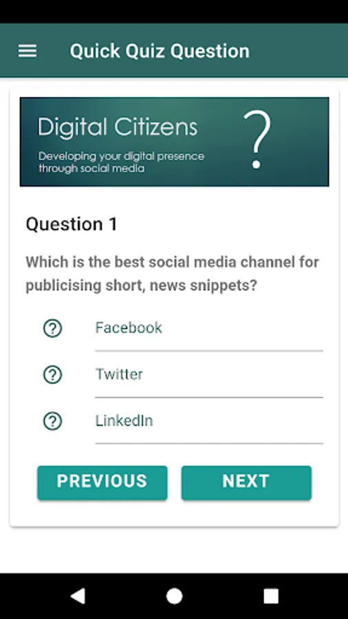 Periodically throughout the course you can choose to answer ‘quick quiz’ questions to check your knowledge of social media use.