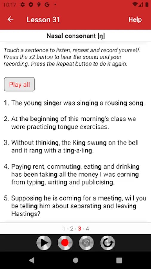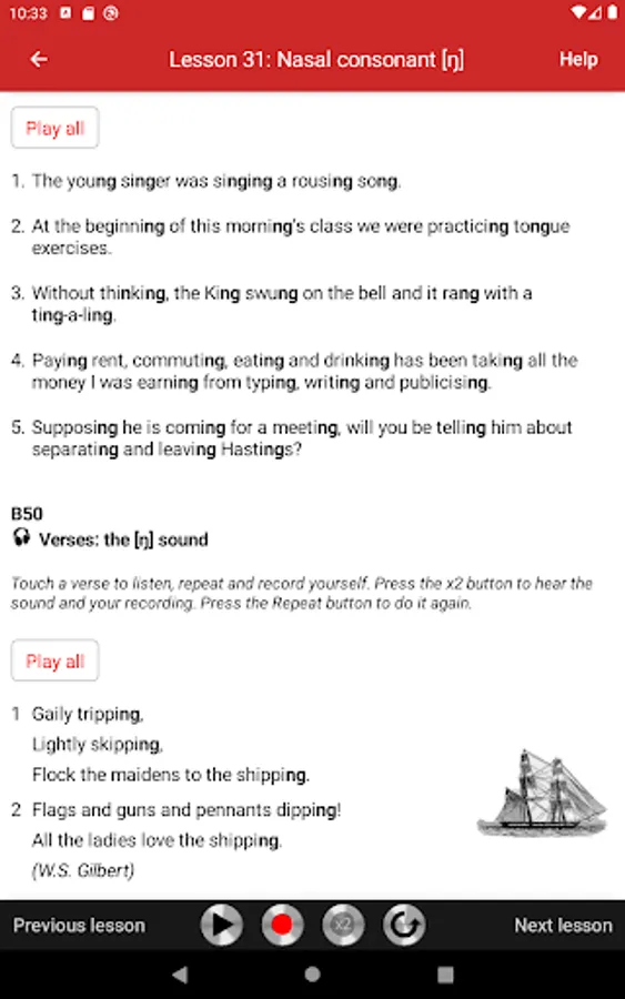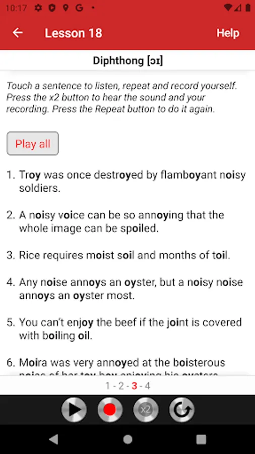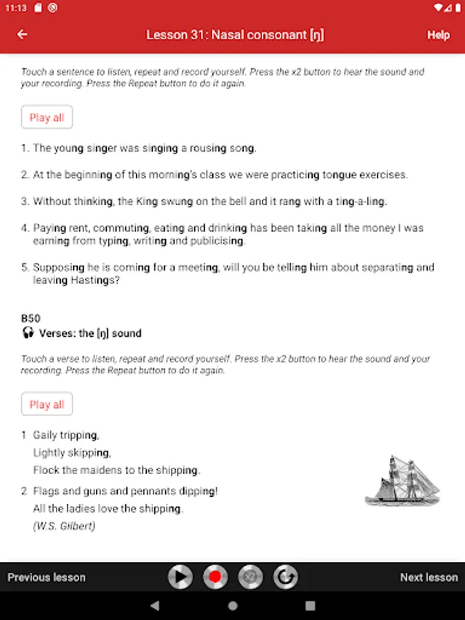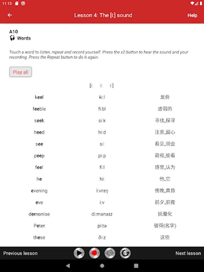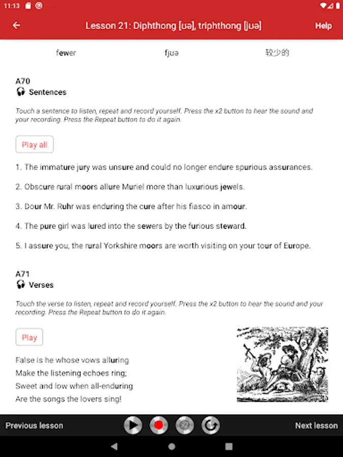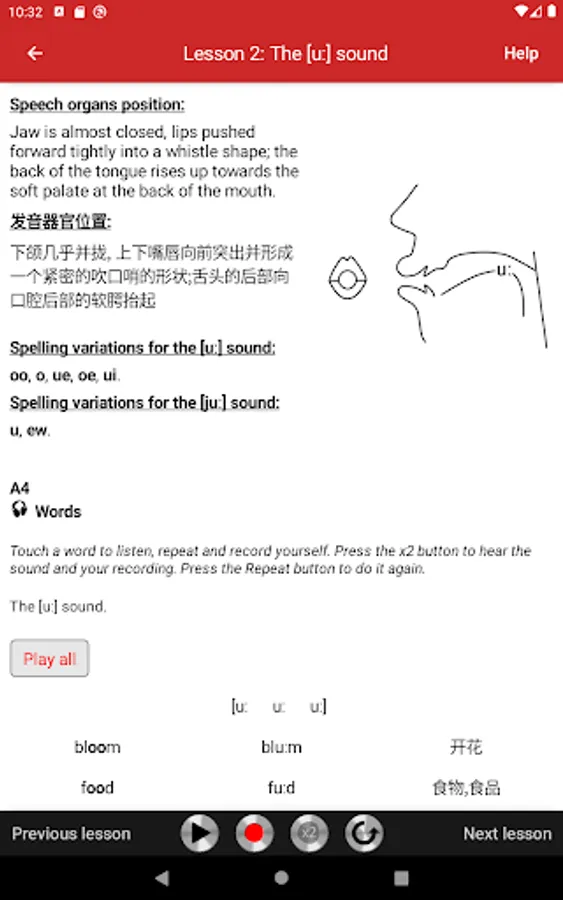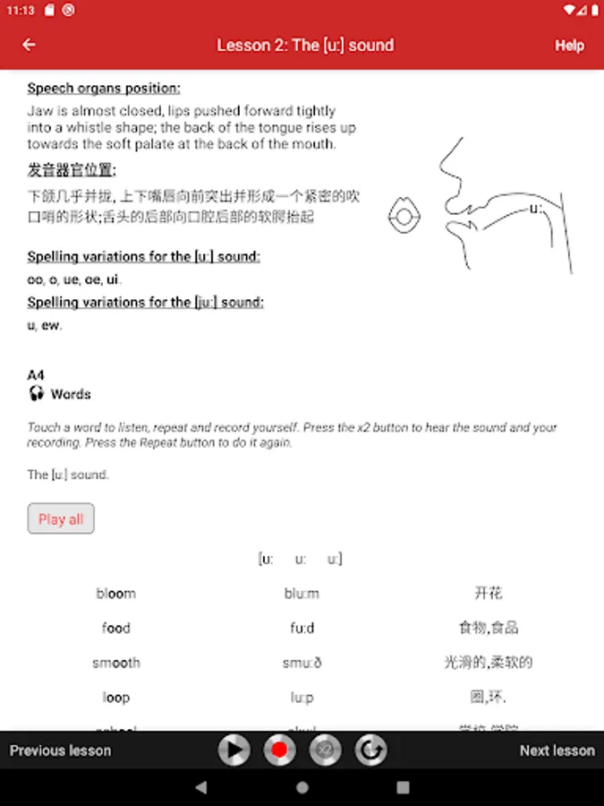 The lessons cover all English sounds needed to master Received Pronunciation, neutral accent of educated southern English and the chief accent taught to foreigners who wish to learn the British model. Each lesson begins with an illustrated description of the speech organ position, followed by practical exercises. The exercises consist of words, amusing sentences, tongue twisters, and verses, taken from literature and conversational English. All exercises are recorded on audio tracks that illustrate the model pronunciation. Students can play audio tracks, record themselves, and compare their pronunciation with the model.