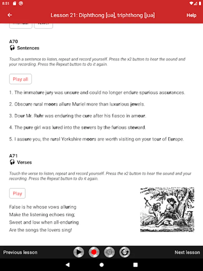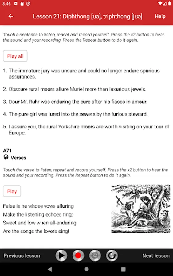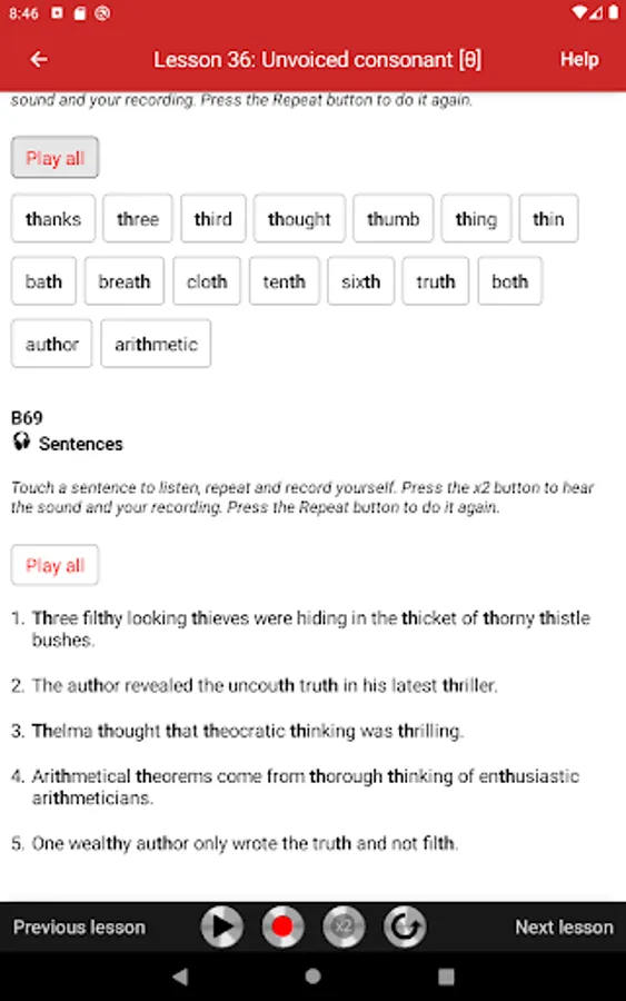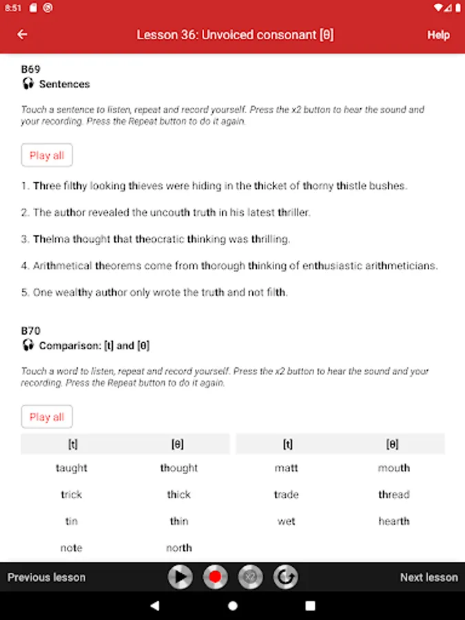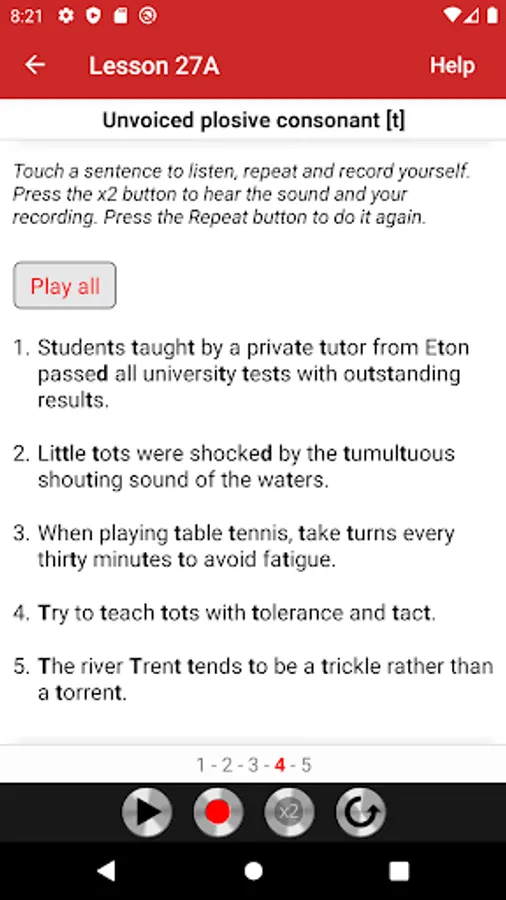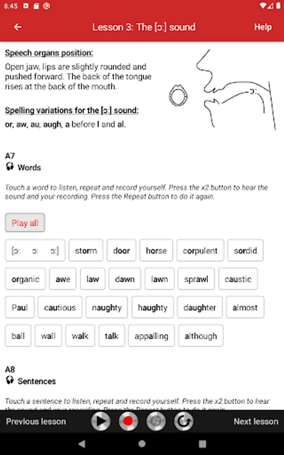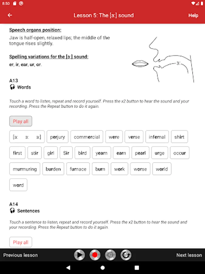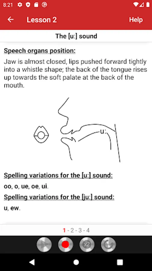 The lessons cover all English sounds needed to master Received Pronunciation, neutral accent of educated southern English and the chief accent taught to foreigners who wish to learn the British model. Each lesson begins with an illustrated description of the speech organ position, followed by practical exercises. The exercises consist of words, amusing sentences, tongue twisters, and verses, taken from literature and conversational English. All exercises are recorded on audio tracks that illustrate the model pronunciation. Students can play audio tracks, record themselves, and compare their pronunciation with the model.