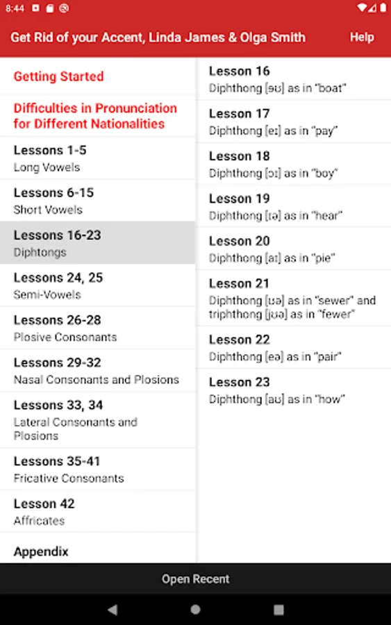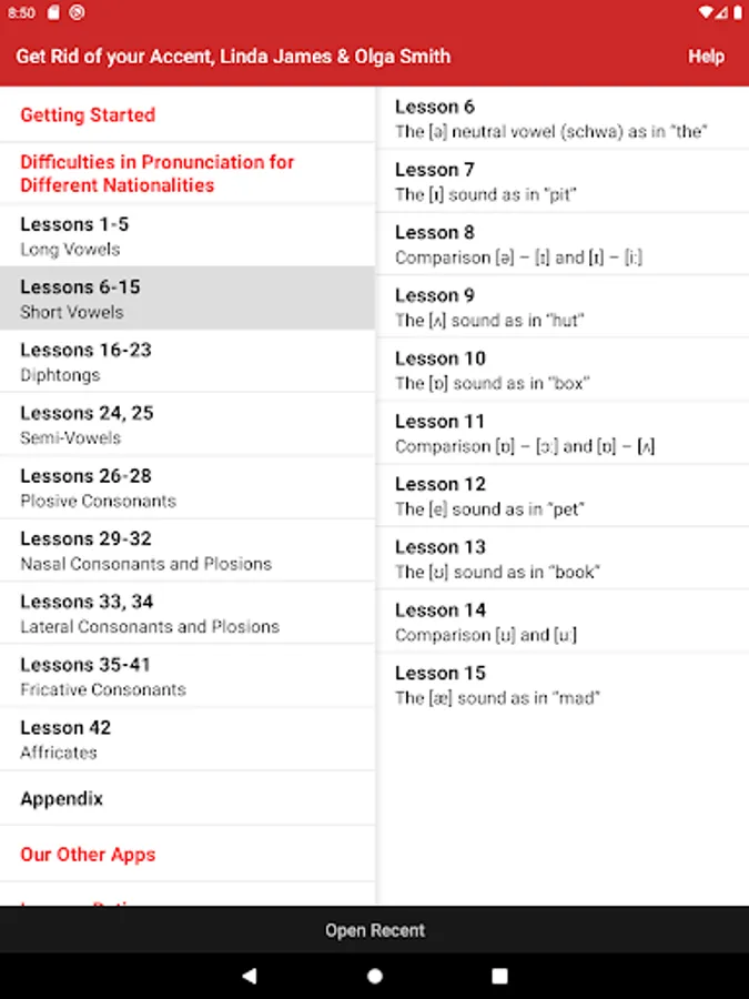 Get Rid of your Accent App is the British English Pronunciation Course at your fingertips, ideal for self-study. It contains 42 audio lessons from the international bestseller Get Rid of your Accent, Part One, by Linda James and Olga Smith (learn more on Developer's Website).