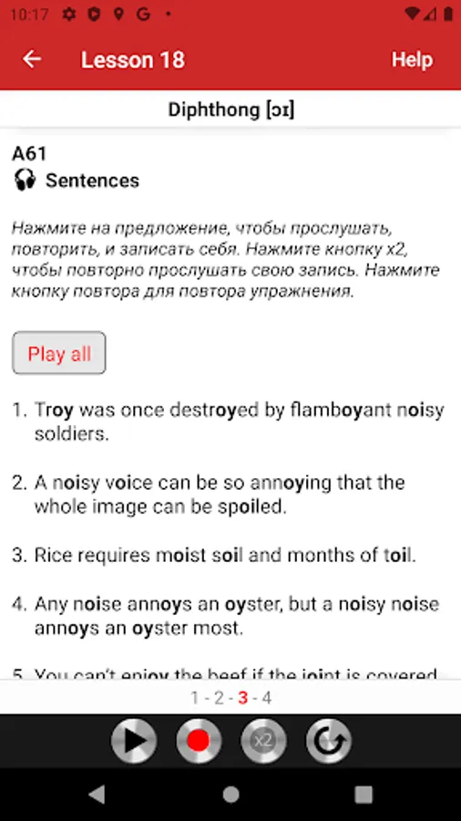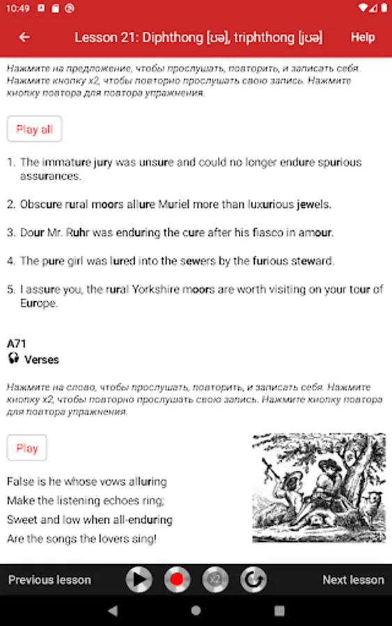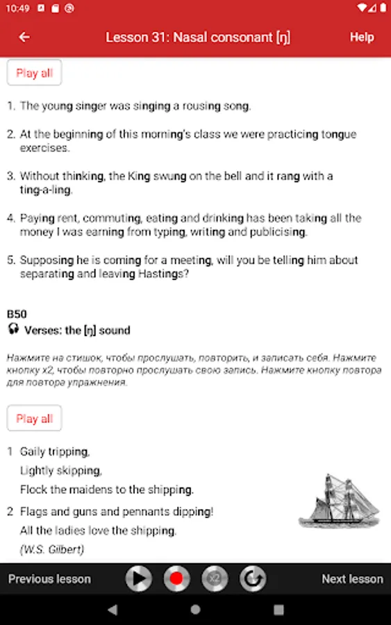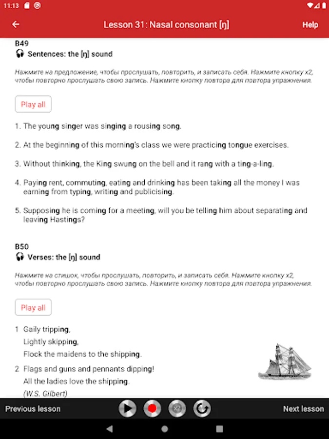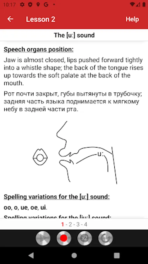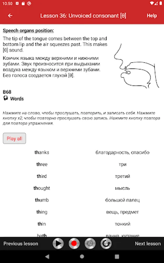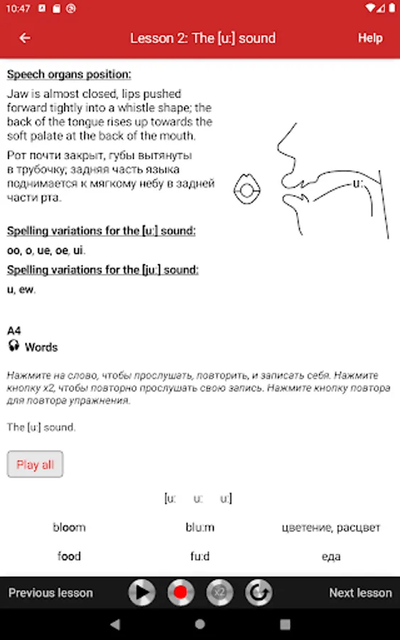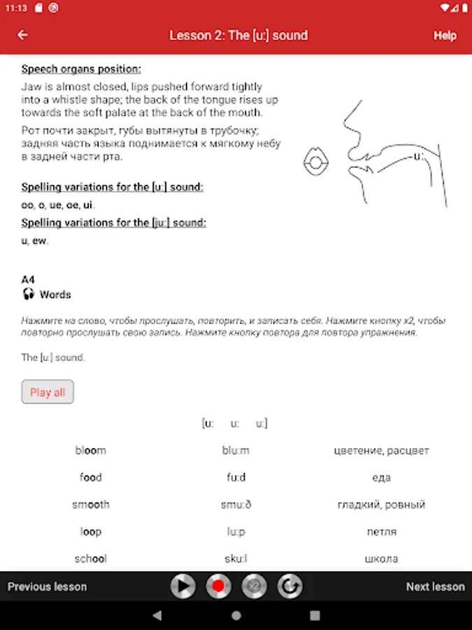 The lessons cover all English sounds needed to master Received Pronunciation, neutral accent of educated southern English and the chief accent taught to foreigners who wish to learn the British model. Each lesson begins with an illustrated description of the speech organ position, followed by practical exercises. The exercises consist of words, amusing sentences, tongue twisters, and verses, taken from literature and conversational English. All exercises are recorded on audio tracks that illustrate the model pronunciation. Students can play audio tracks, record themselves, and compare their pronunciation with the model.