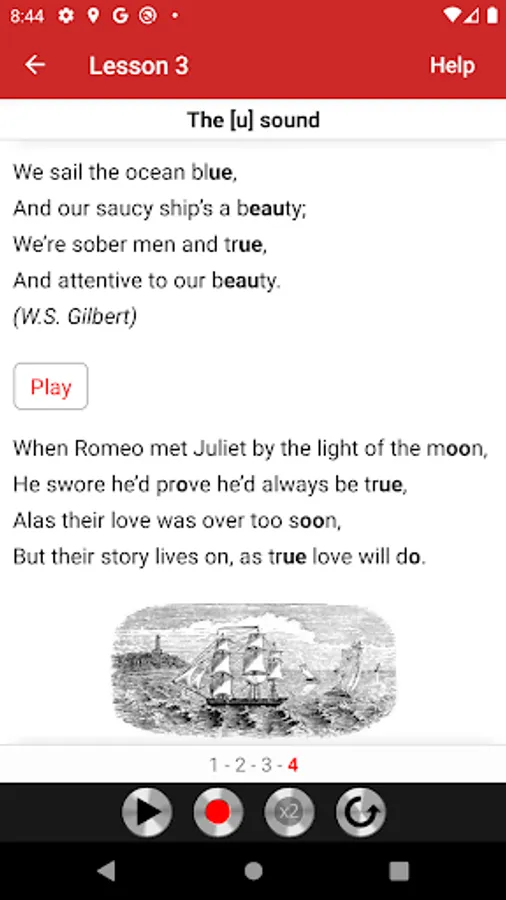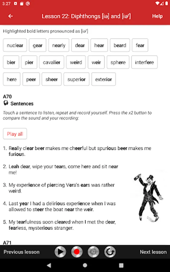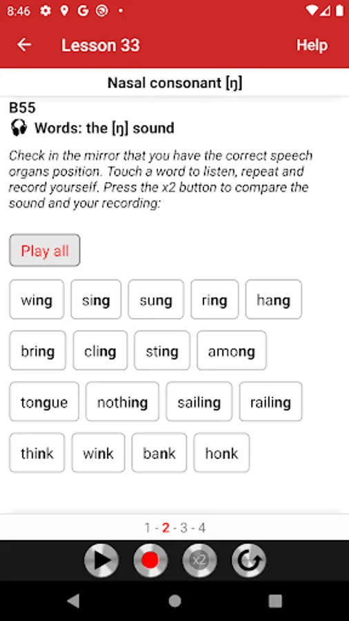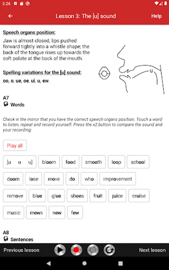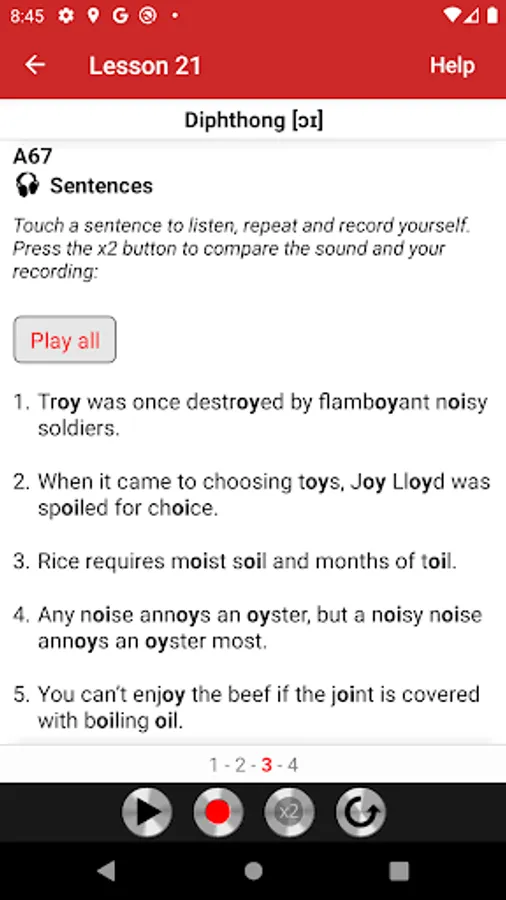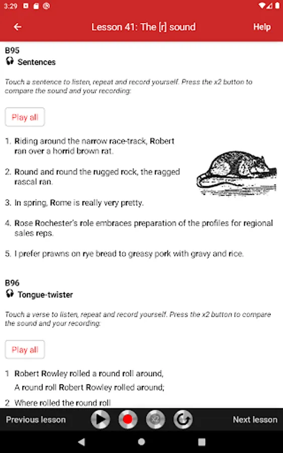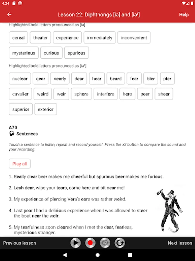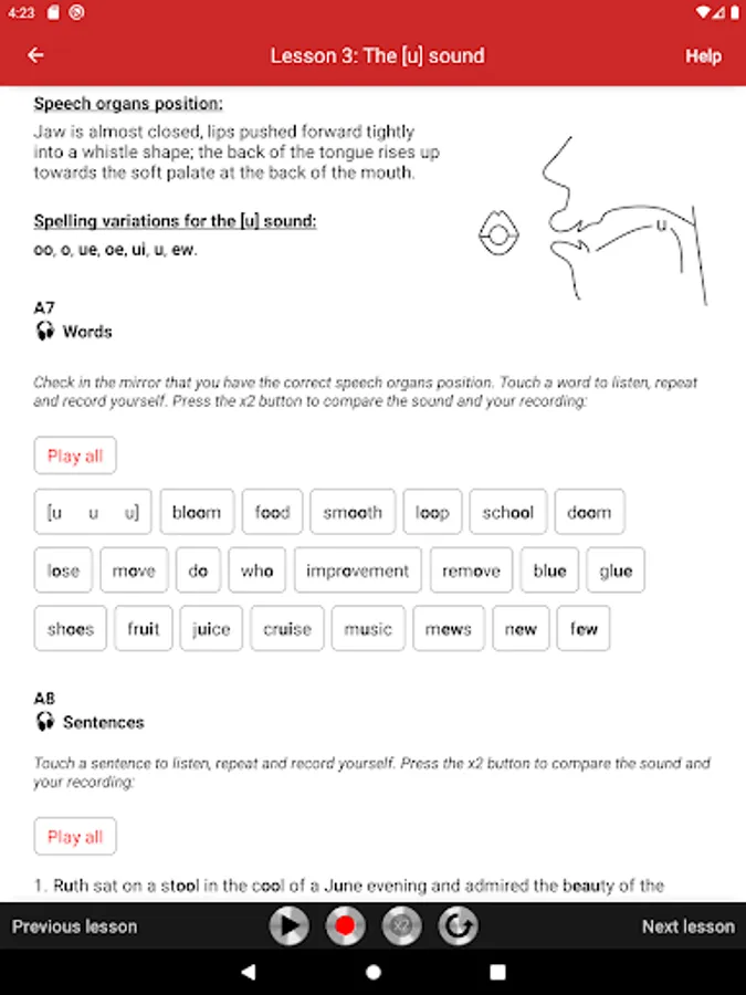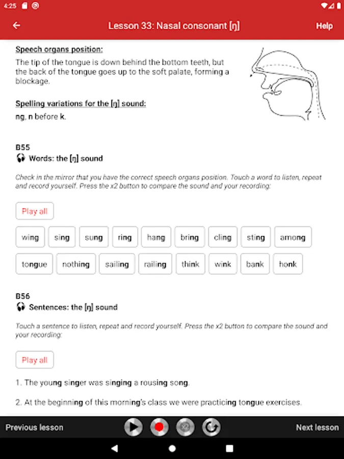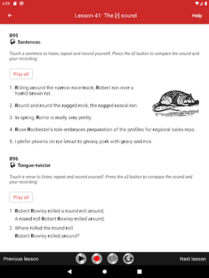 All exercises are recorded on audio tracks that illustrate the model pronunciation. Students can play audio tracks, record themselves, and compare their pronunciation with the model. The app is very easy to use. Simply touch the screen to play audio tracks, record yourself, and compare your pronunciation with the model.