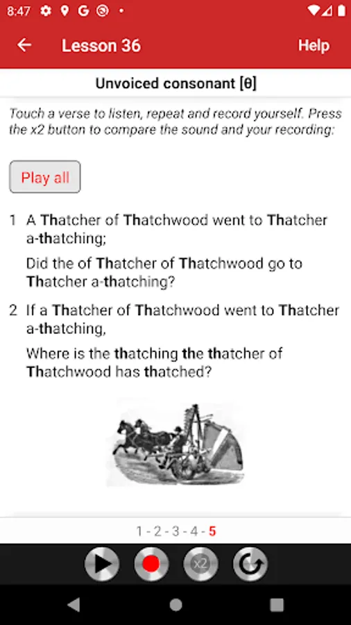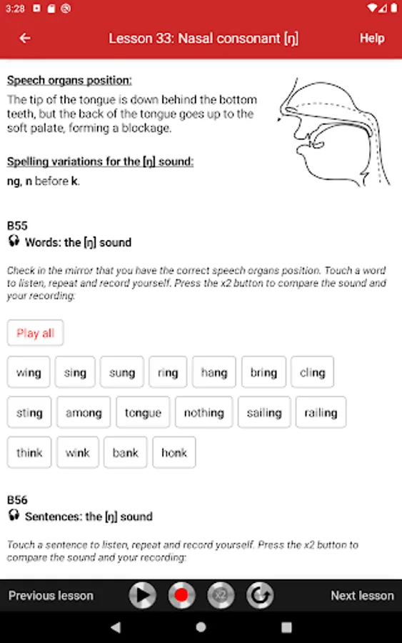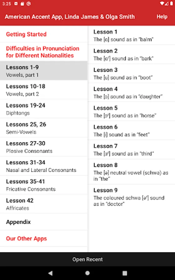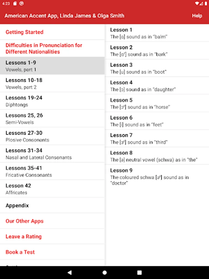 The app has 10% theory and 90% effective practical exercises from Part One of the book Get Rid of your Accent Part One and Two, General American Accent Training Manual, ISBN 9780955330087. It contains 42 audio lessons. Where appropriate, a lesson begins with an illustrated description of the speech organ position, followed by practical exercises. The exercises consist of words, amusing sentences, tongue twisters, and verses, taken from literature and conversational English.